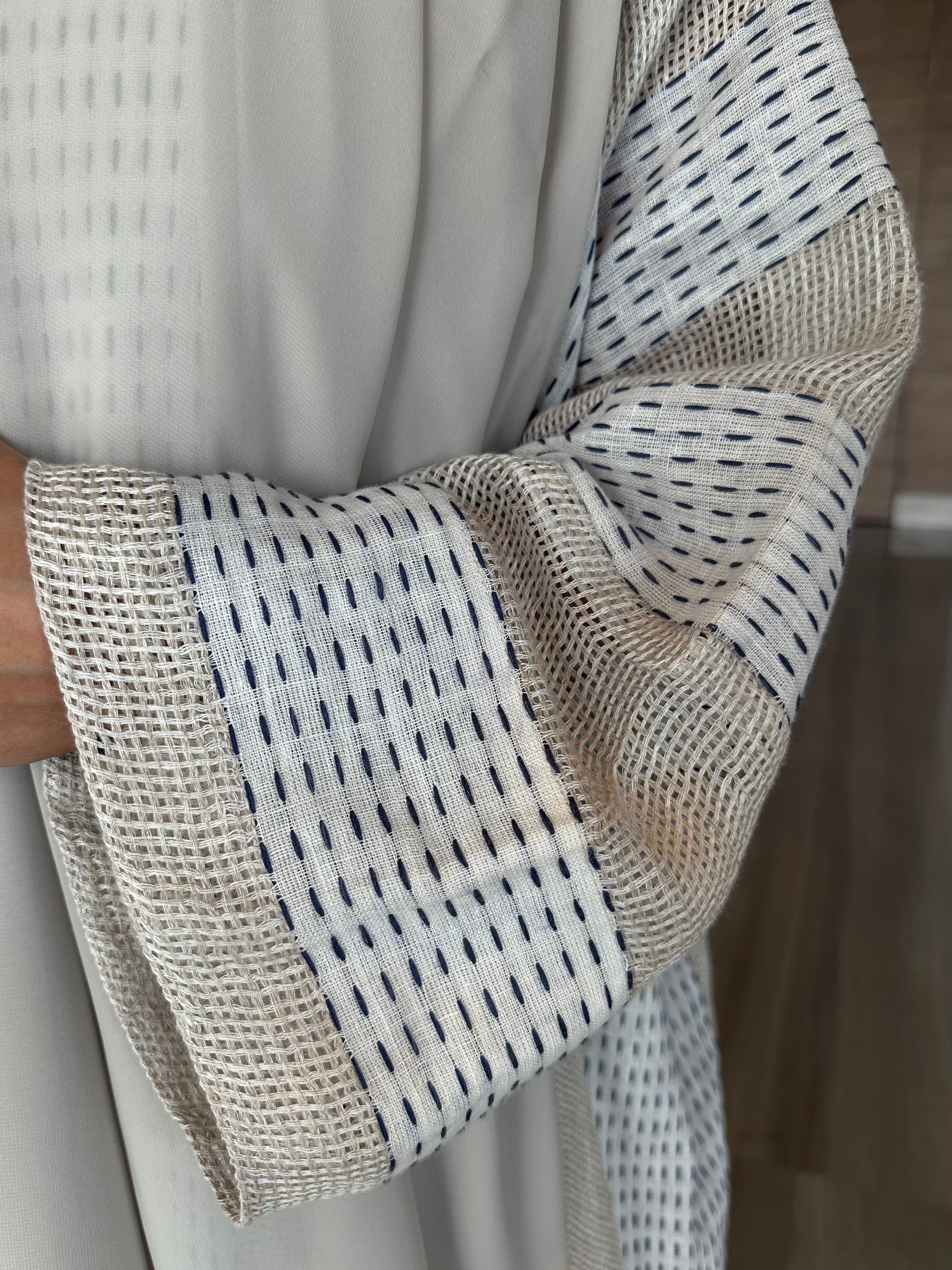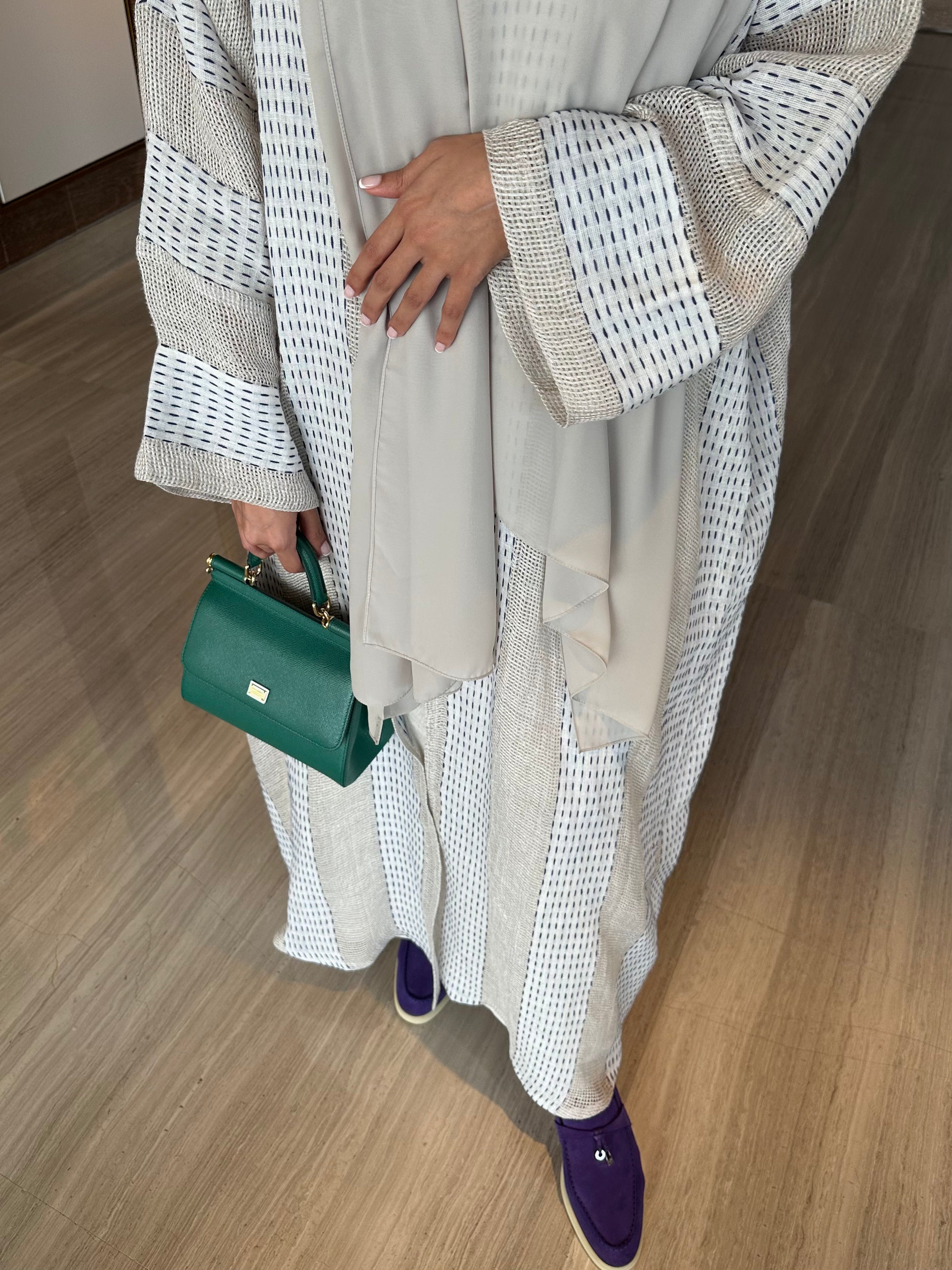 عباية كتان بيج ، قصة مستقيمة ، مع طرحة.