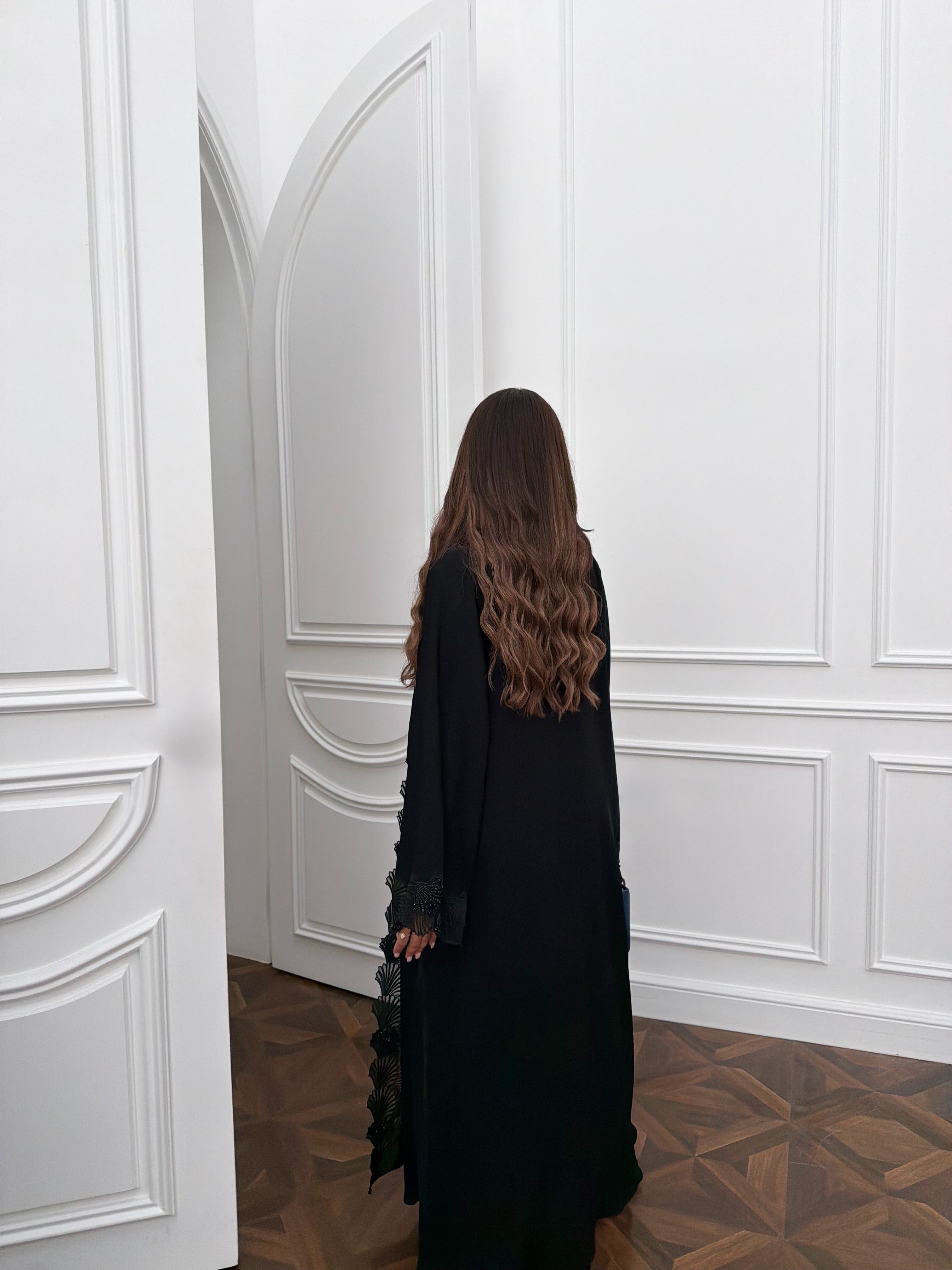 A sophisticated black Nada fabric abaya designed in a flattering A-line cut. Crafted from ultra-soft, flowy material for a refined and comfortable feel. Finished with delicate hand embroidery and subtle crystal embellishments along the front and sleeves. Perfect for elegant day-to-evening wear.