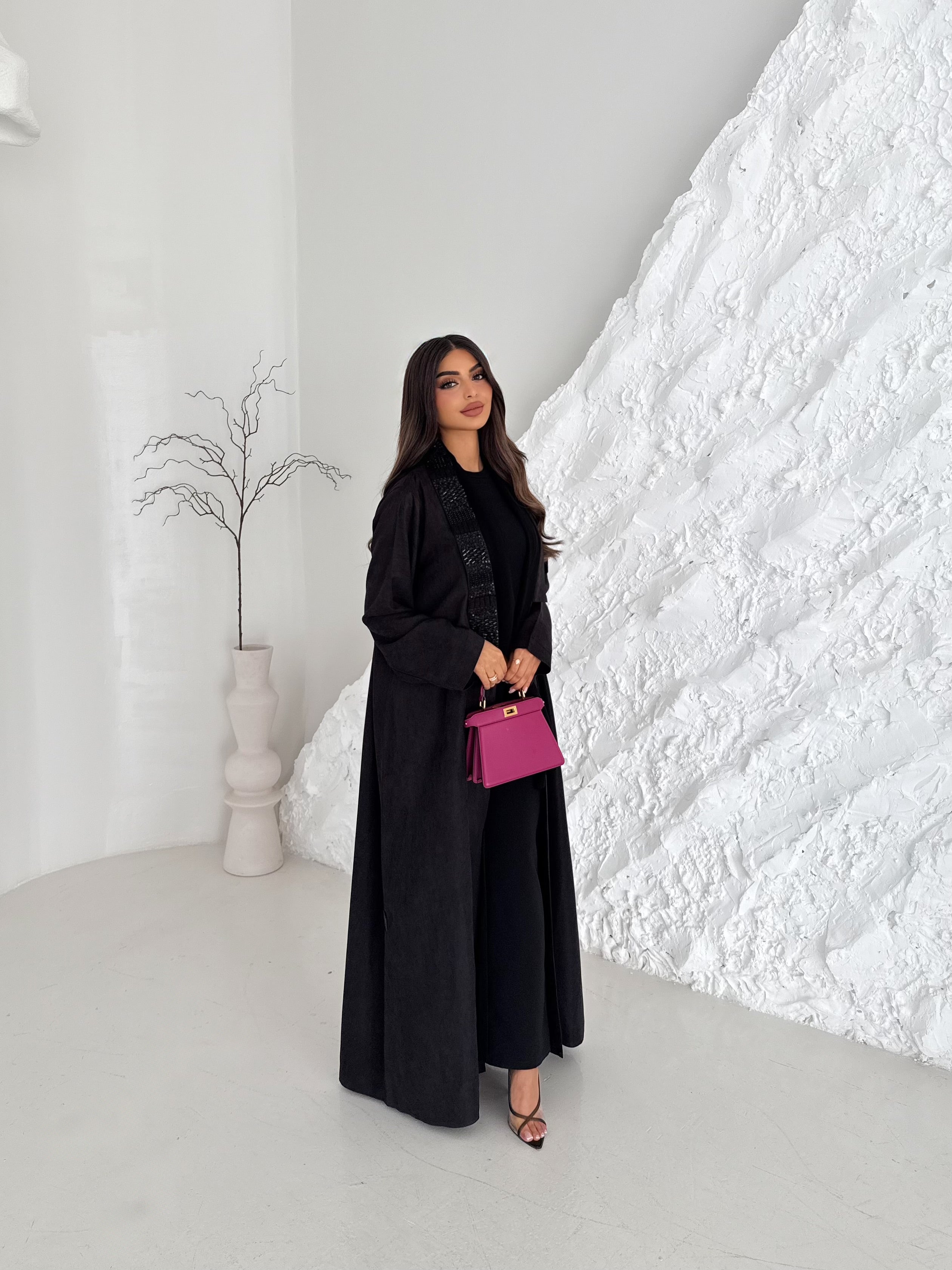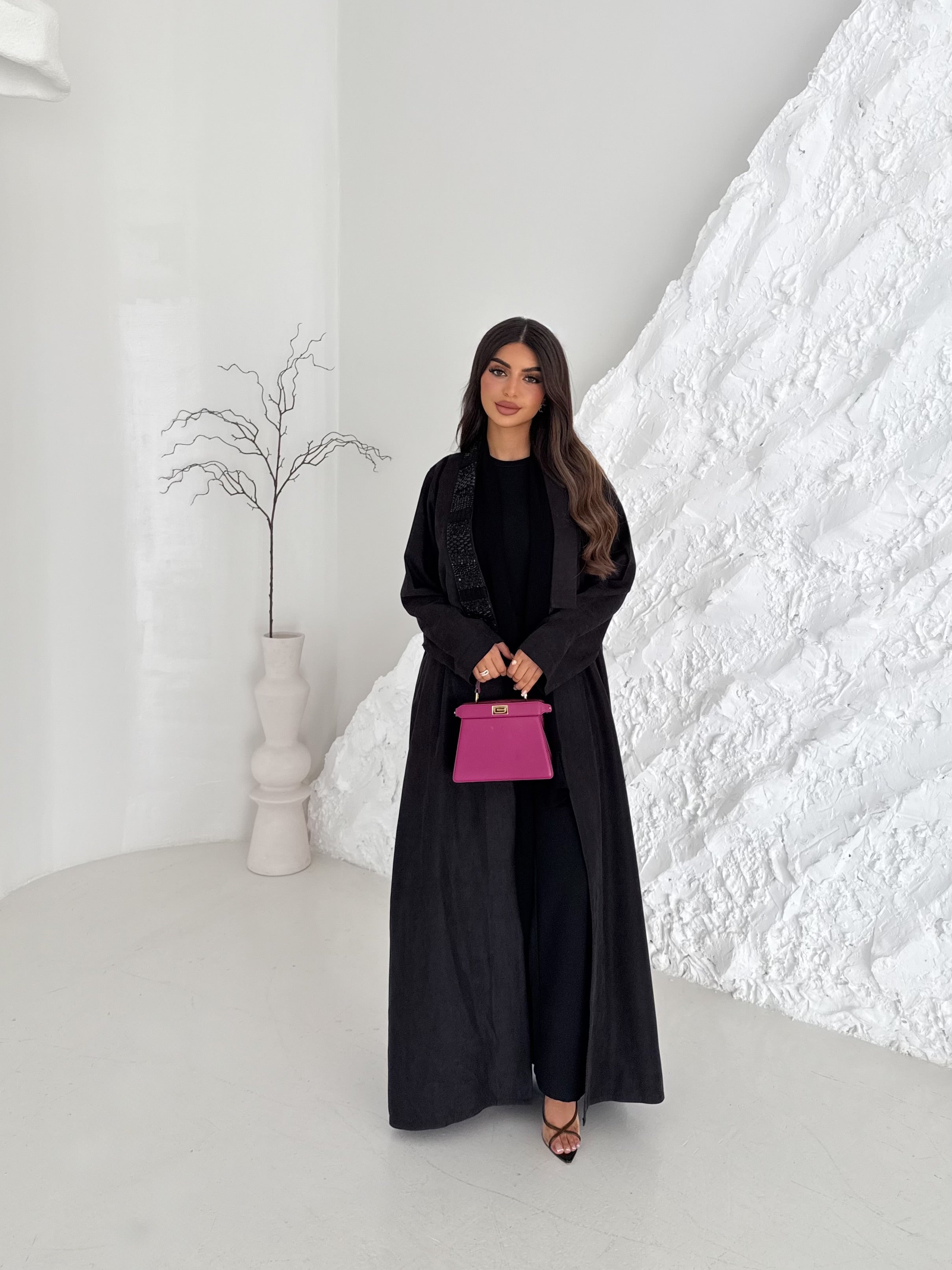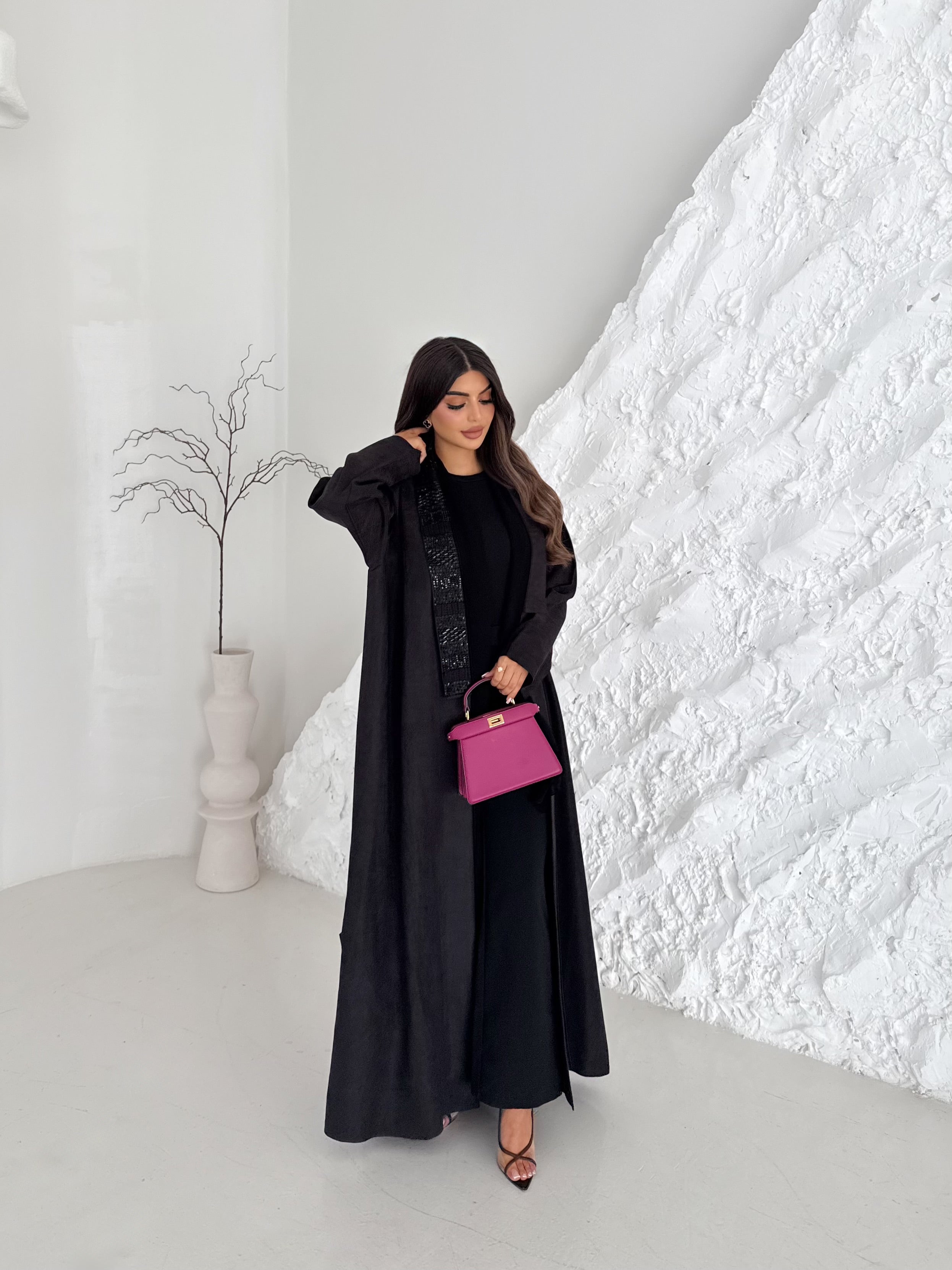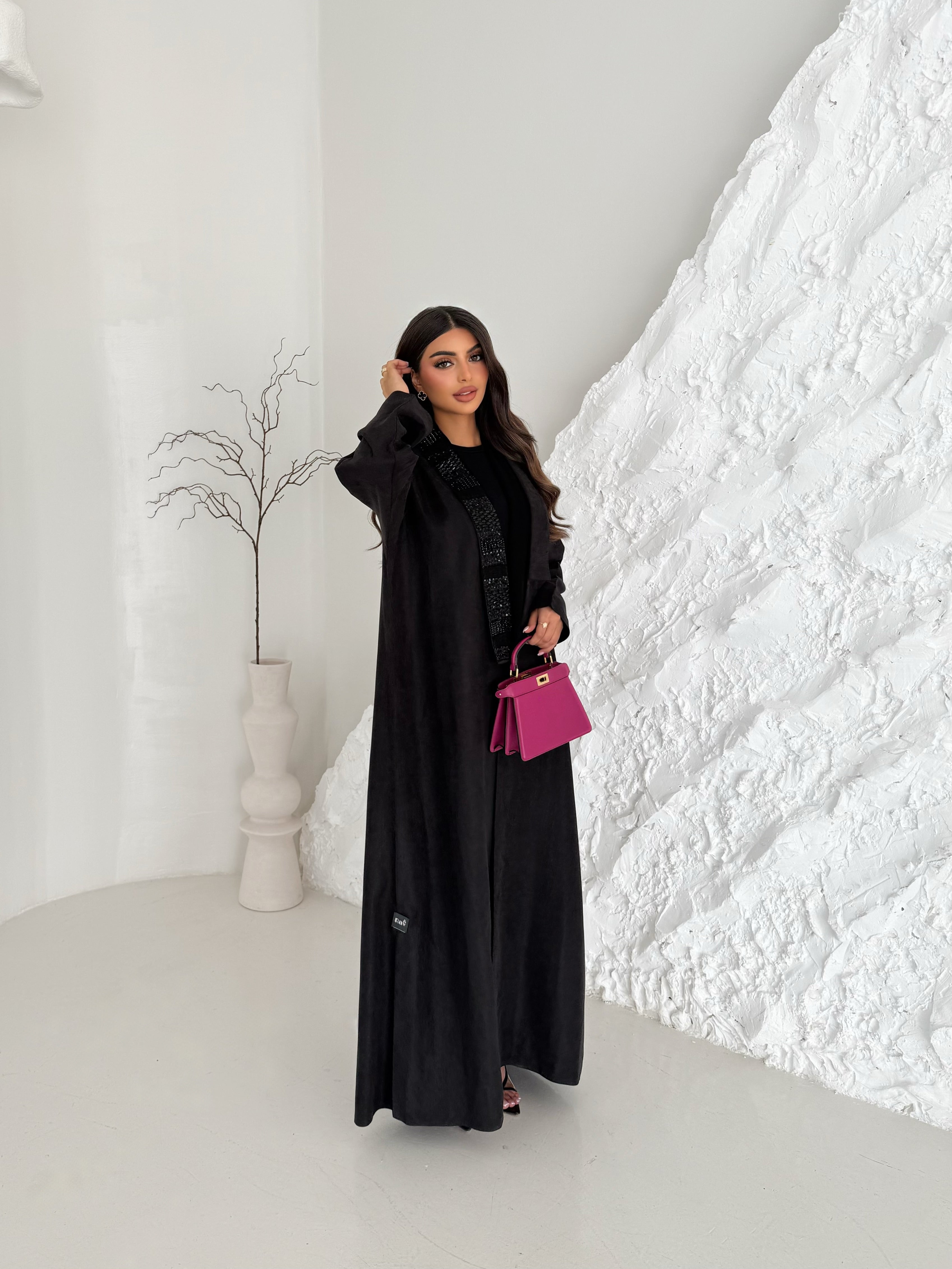Black abaya with a simple straight cut, elevated by hand-embellished beaded panels along the front for a refined textured look.