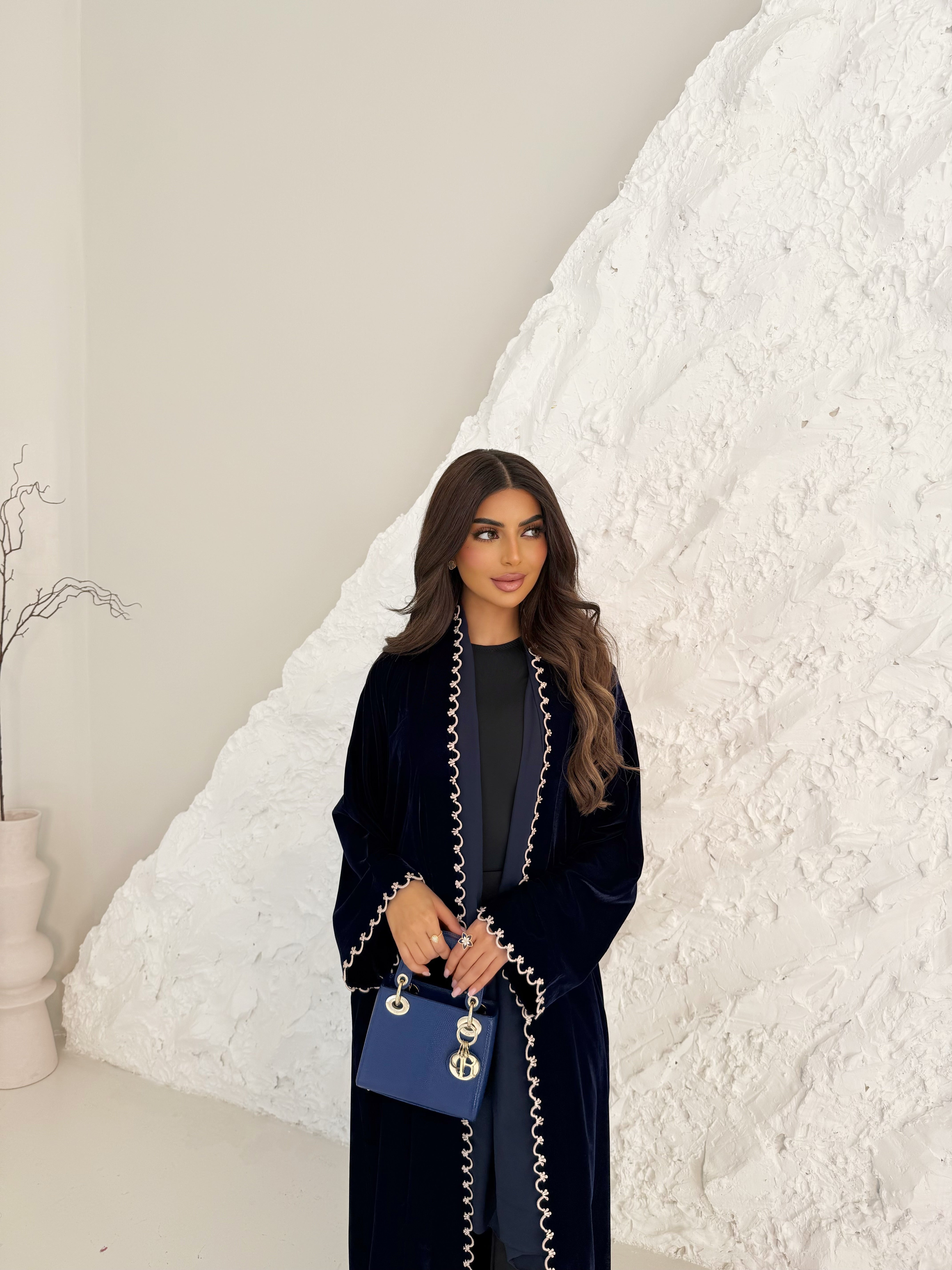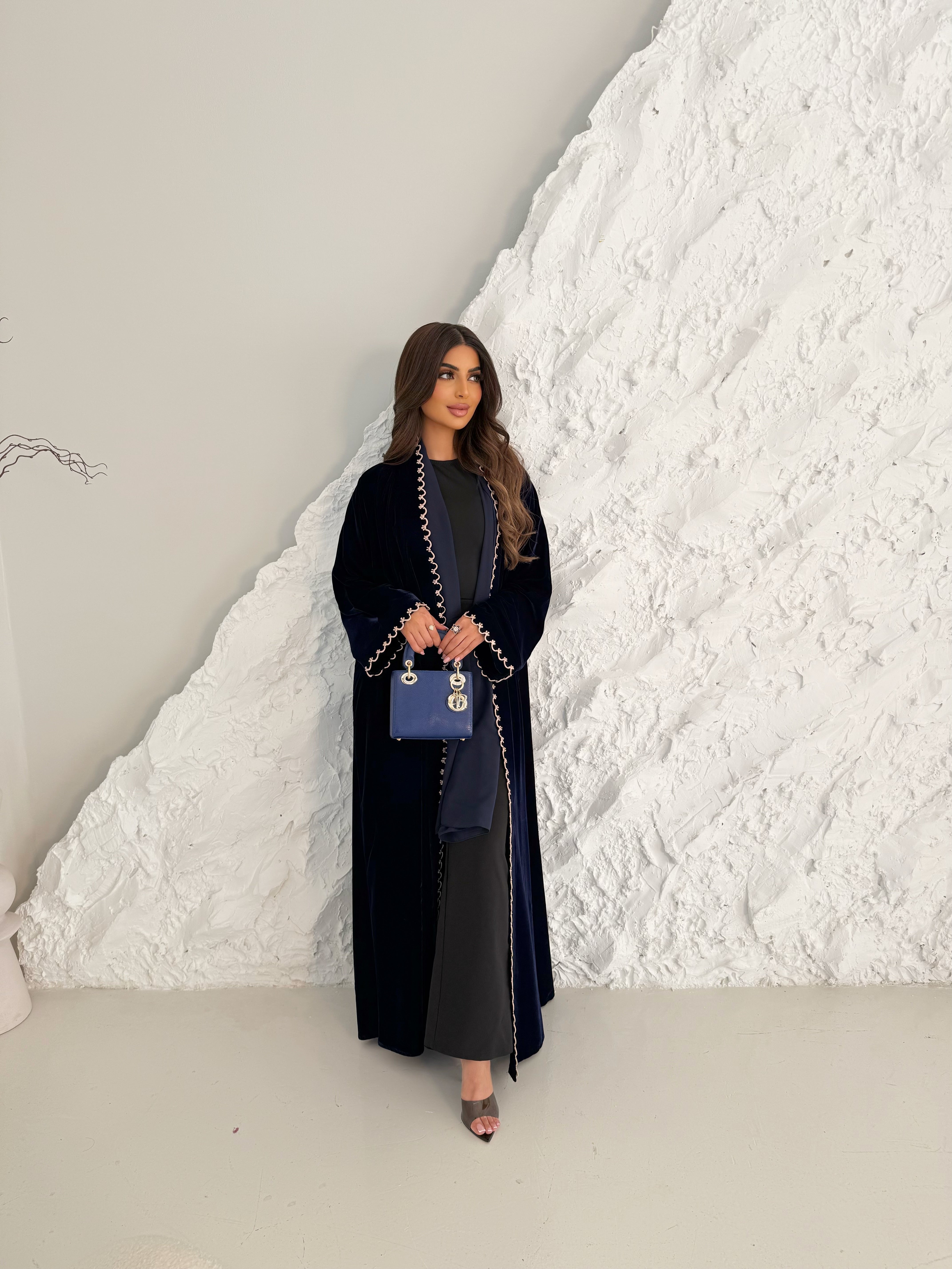 Midnight navy velvet abaya with delicate ivory embroidery, paired with a plain navy hijab for a refined, timeless look.