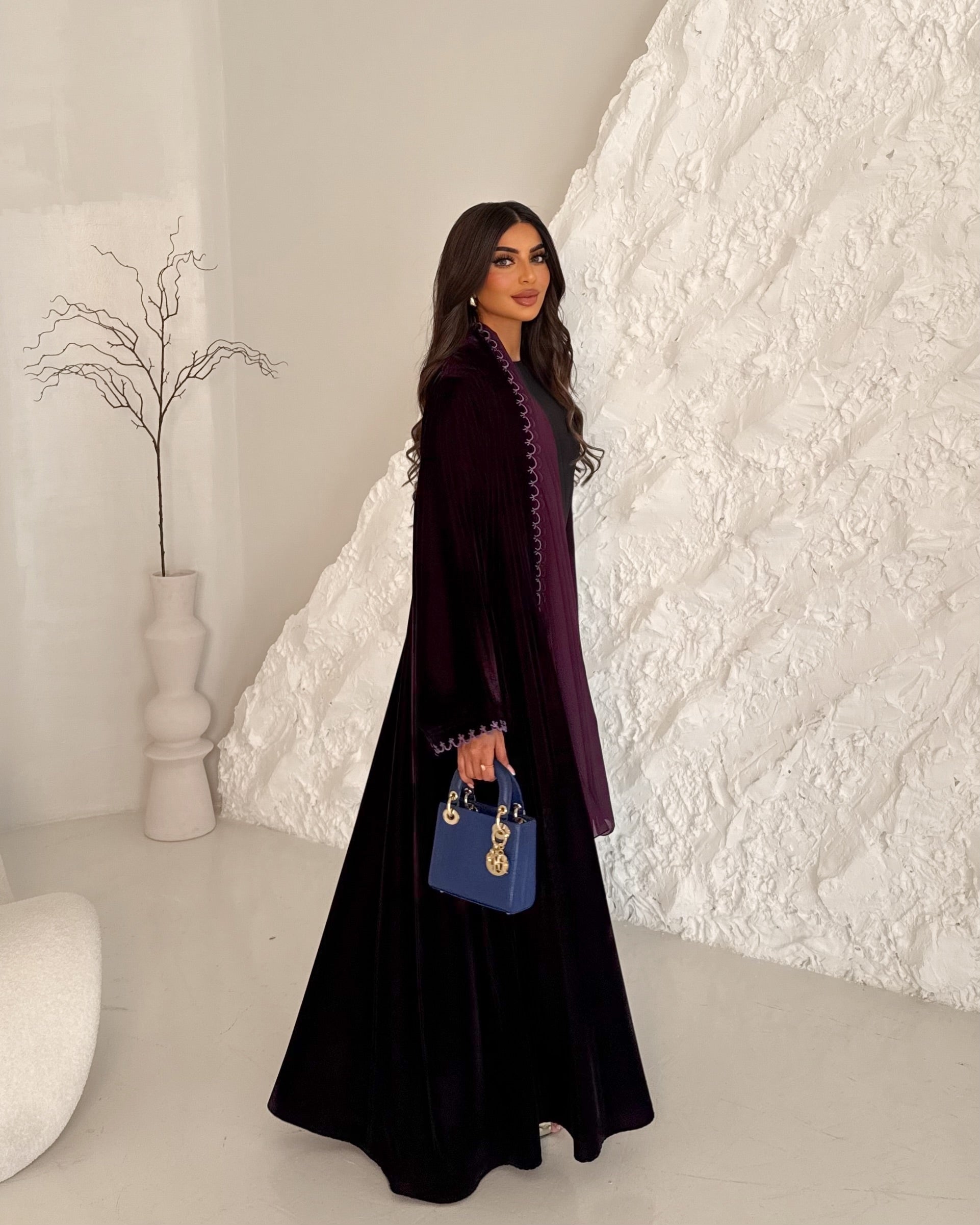 Dark Purple velvet abaya with delicate embroidery, paired with a plain purple hijab for a refined, timeless look.