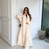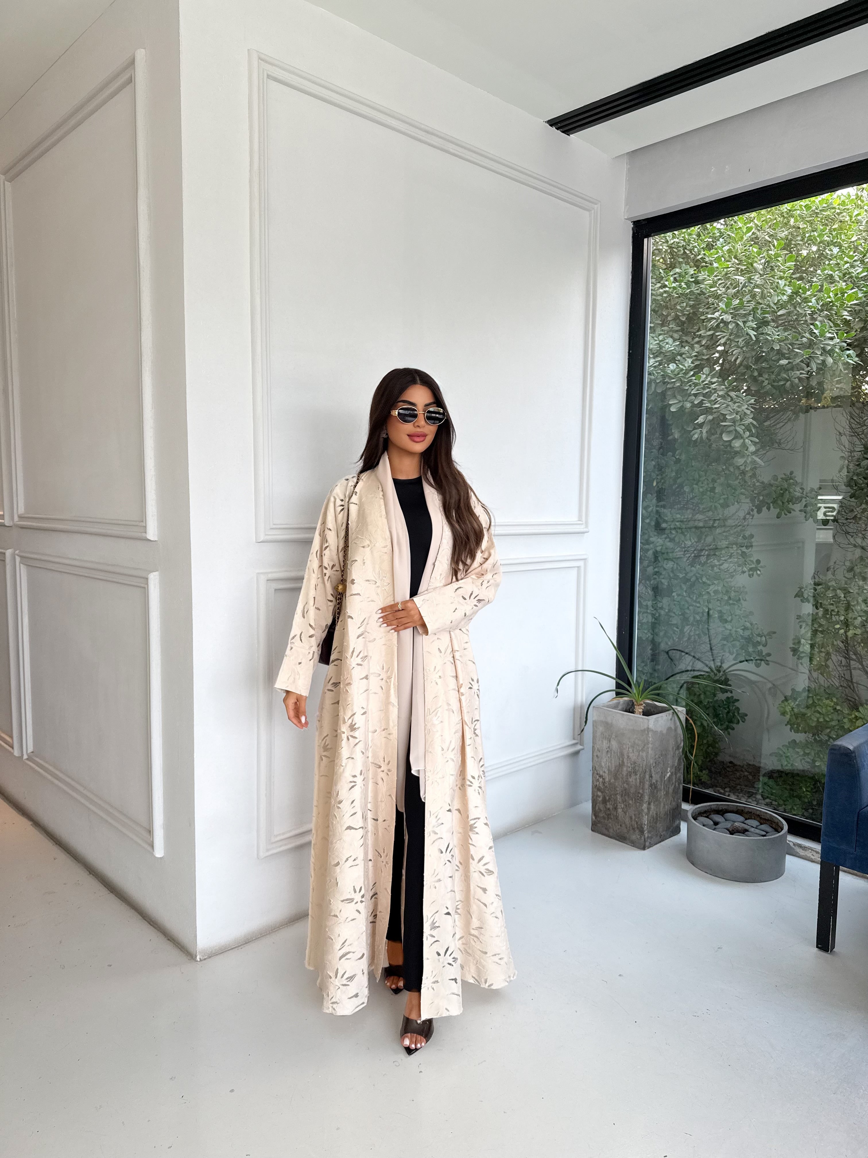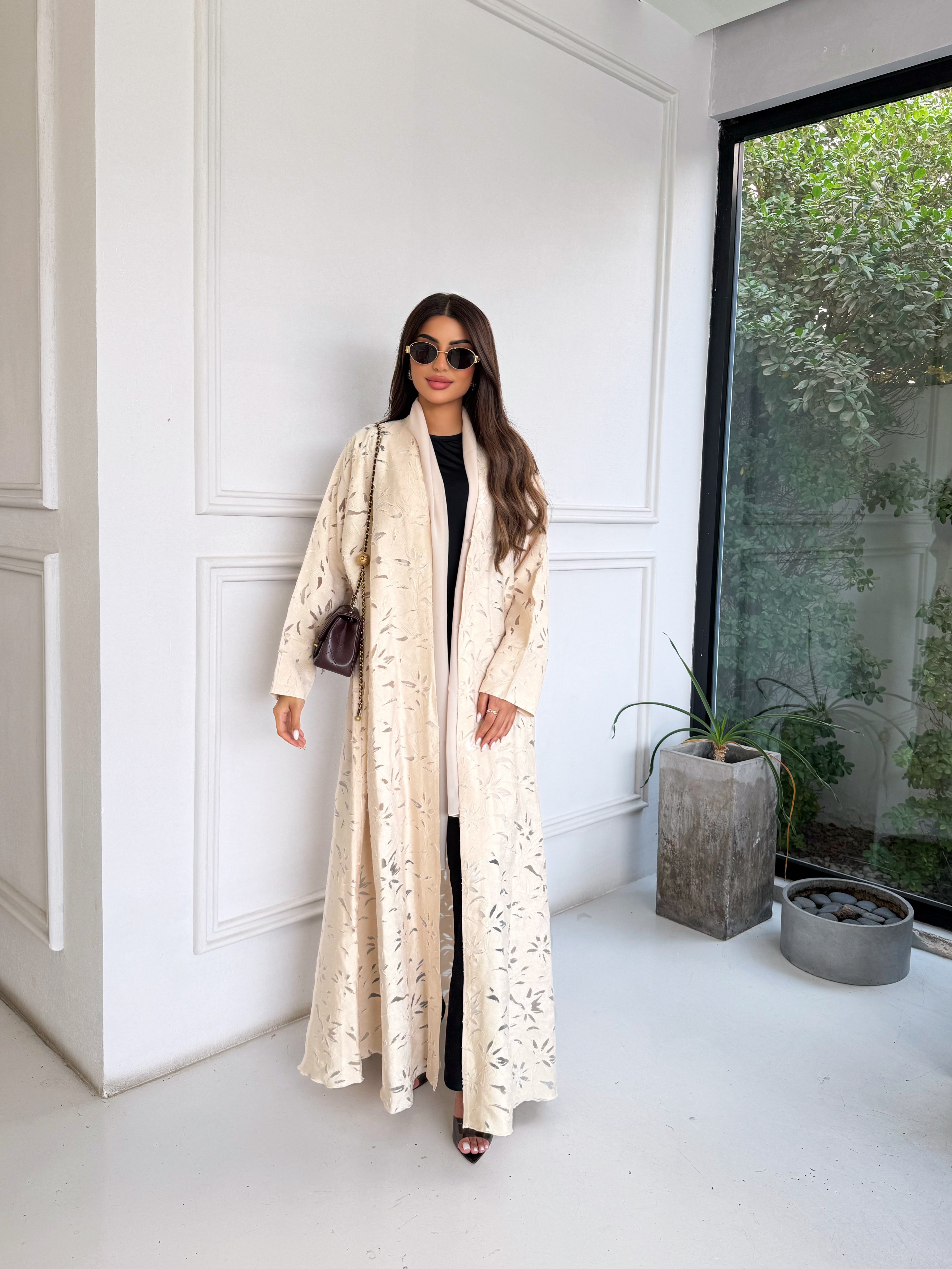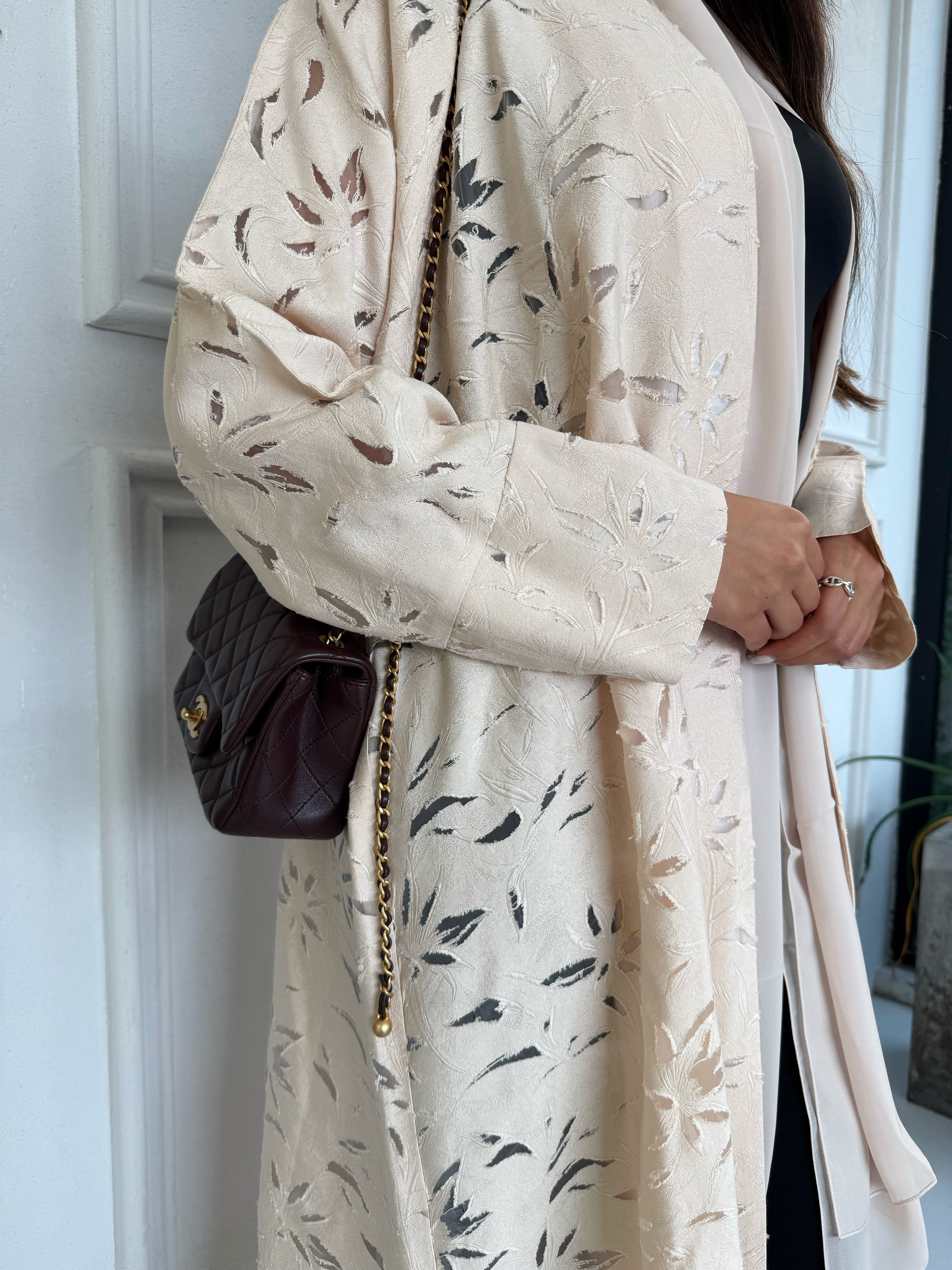 A lightweight abaya crafted from soft floral-patterned fabric in a creamy hue. Its airy texture and flowing silhouette make it a perfect summer statement of effortless elegance. Comes with a plain matching scarf