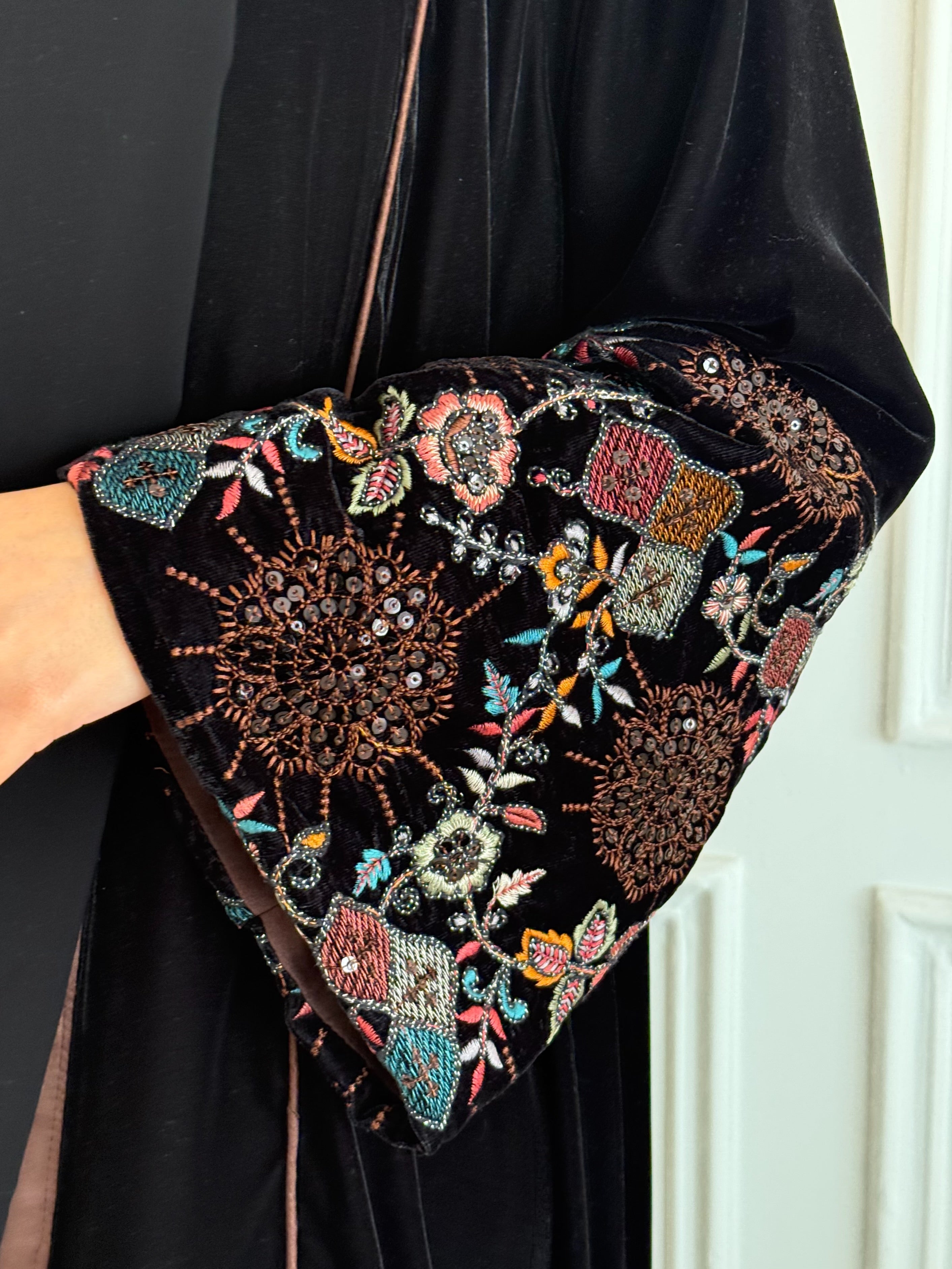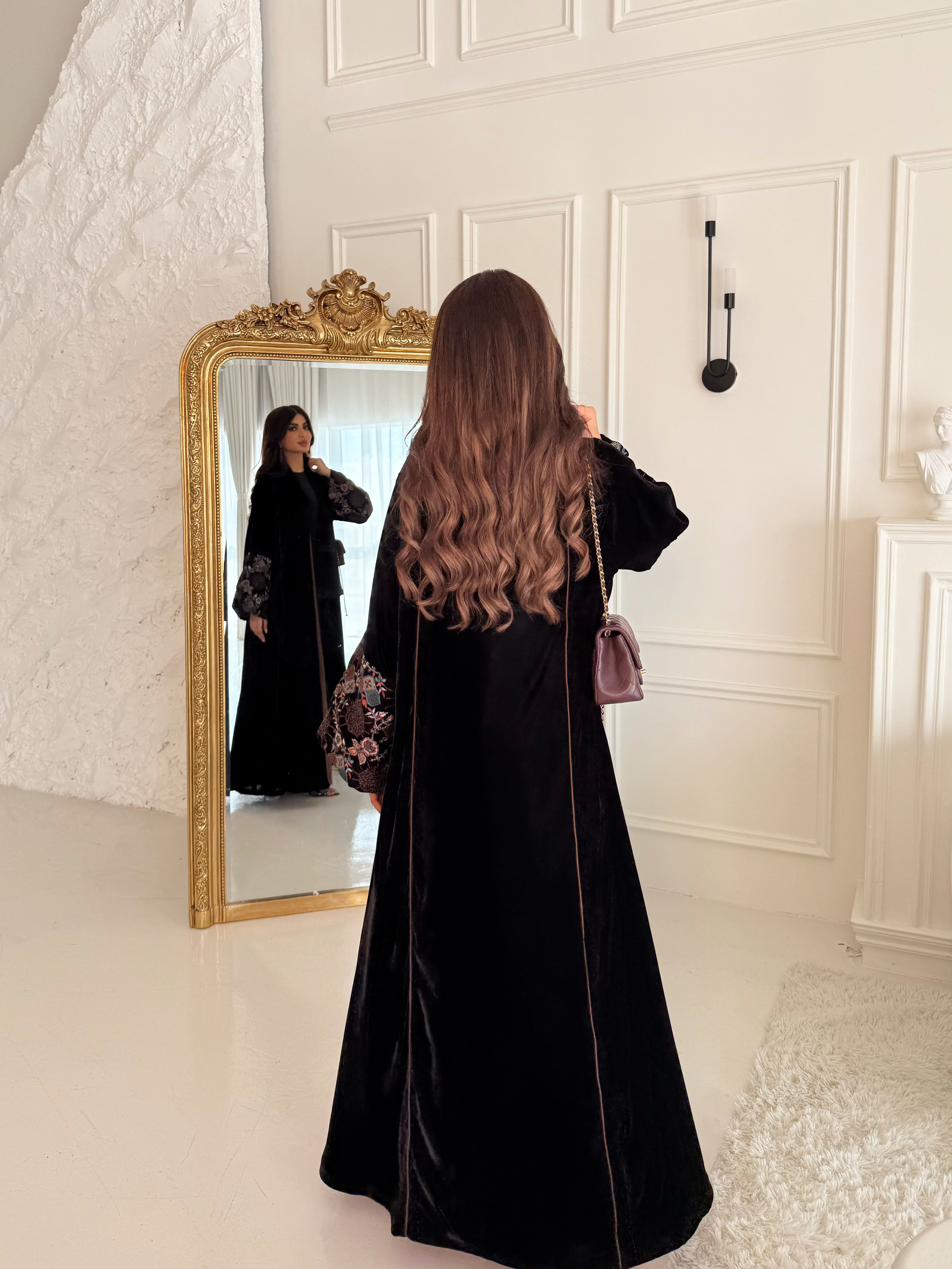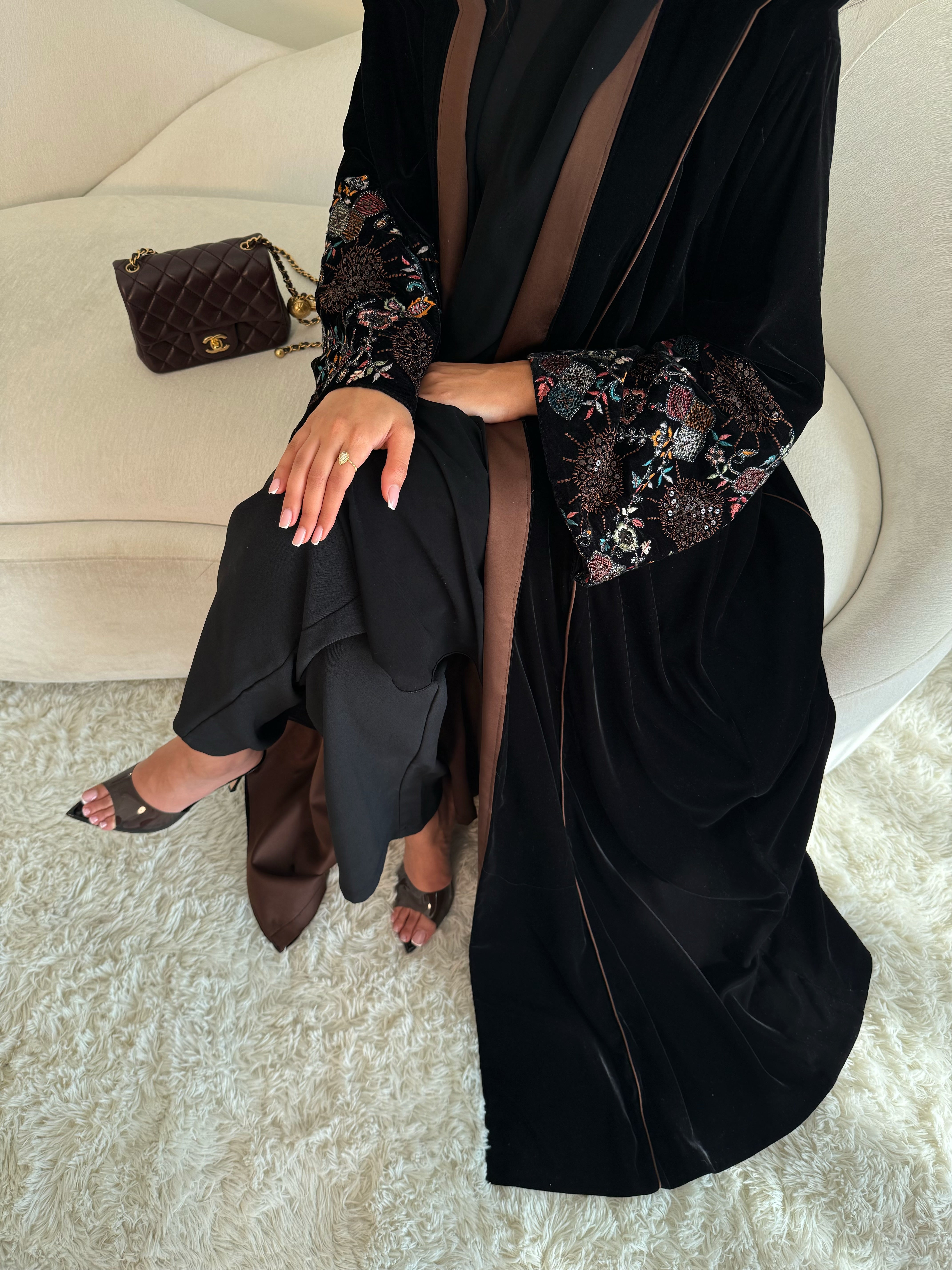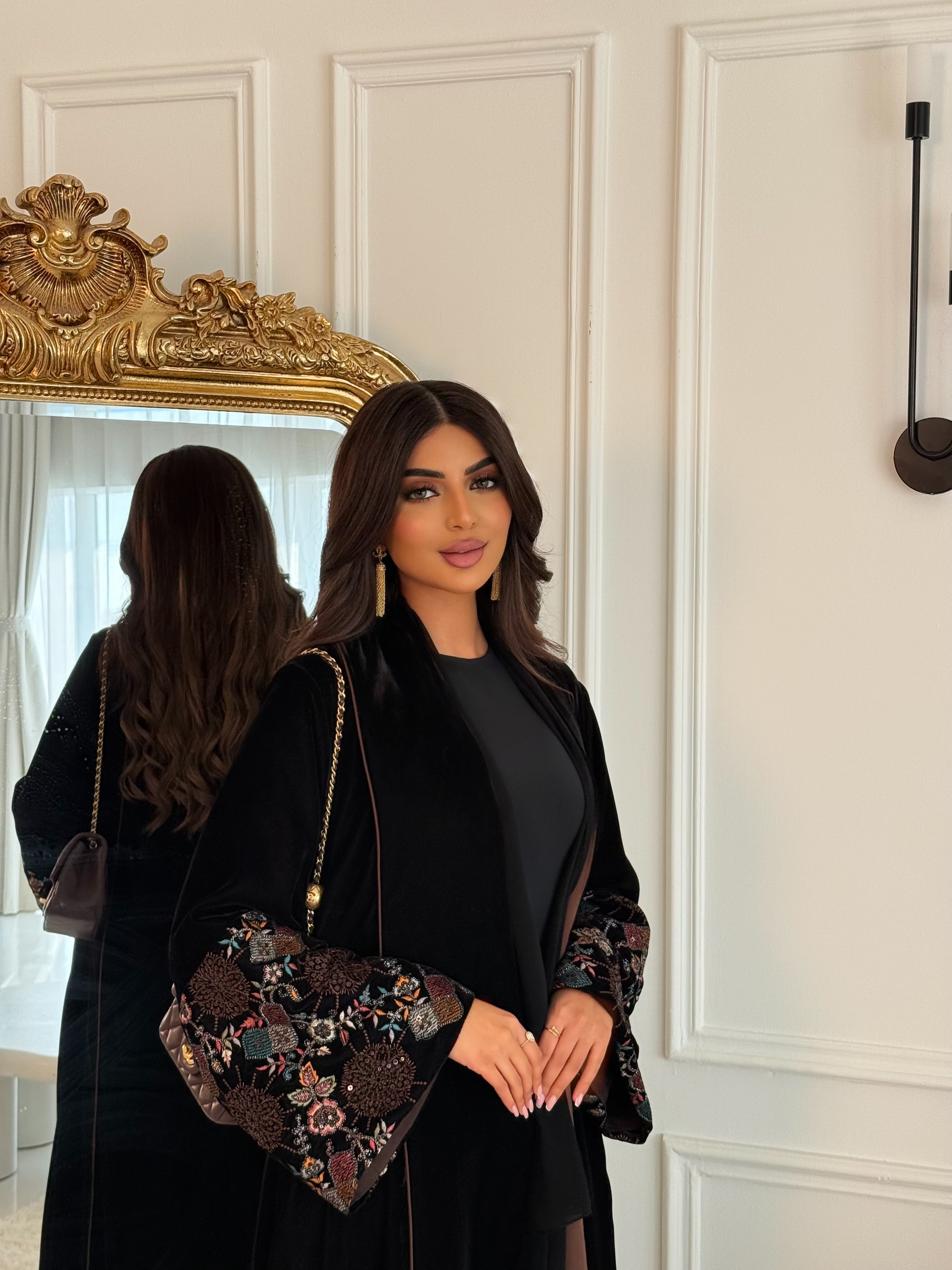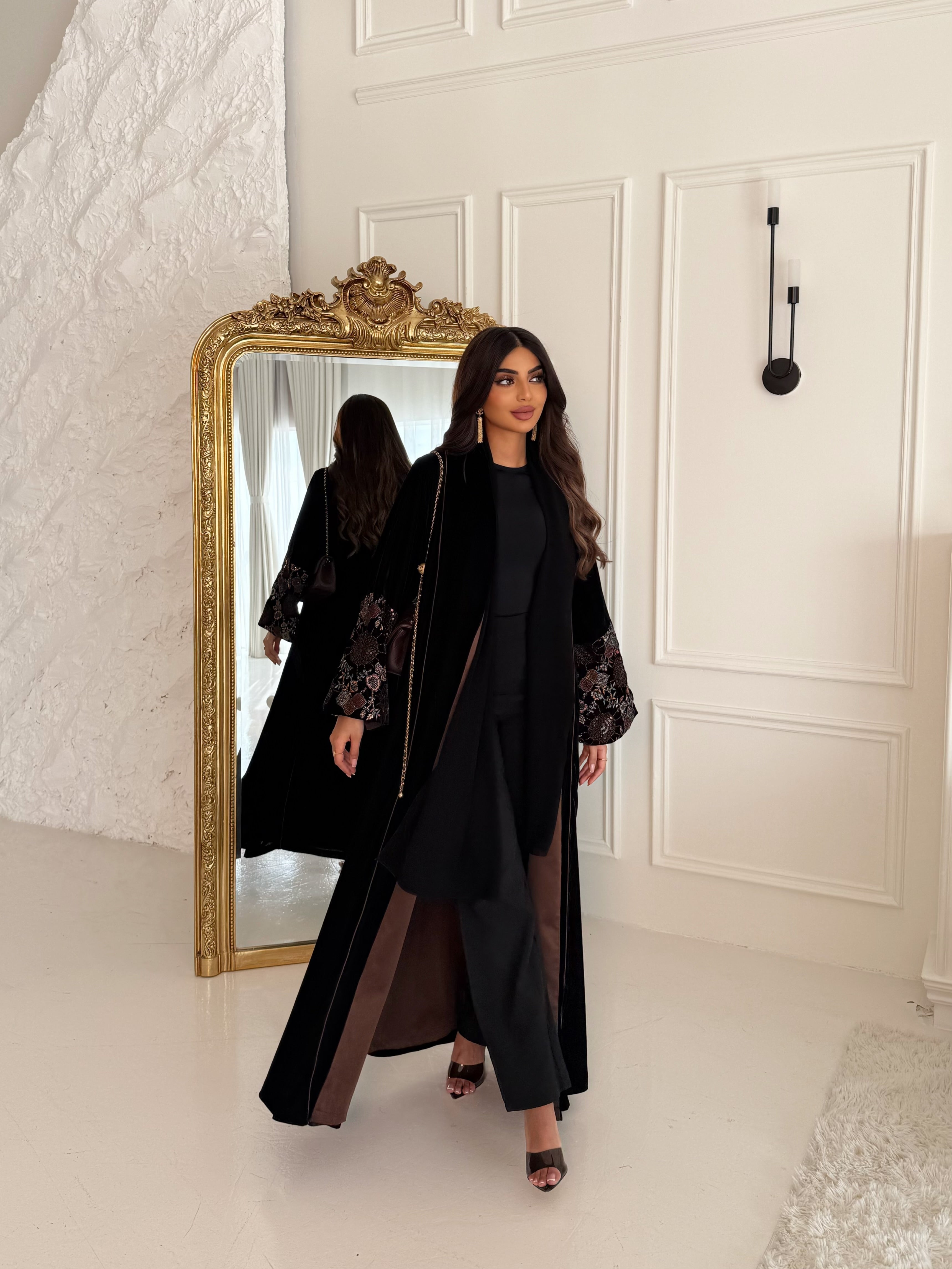 A refined black velvet abaya, elegantly lined with smooth brown silk for a soft, flowing finish. The velvet sleeves are adorned with intricate embroidery, adding depth and understated luxury. Paired with a simple black sheila, this piece embodies timeless elegance and quiet sophistication.