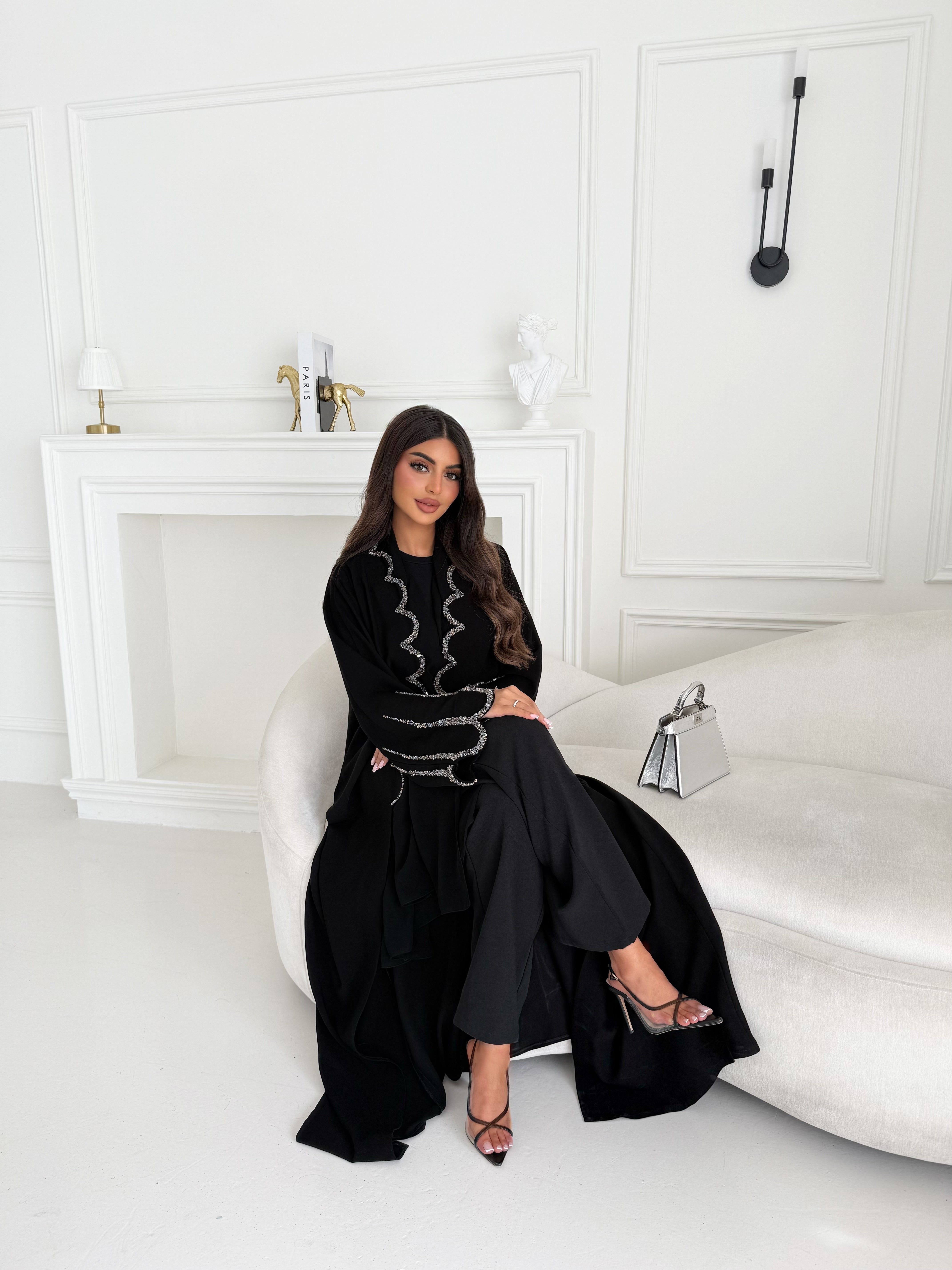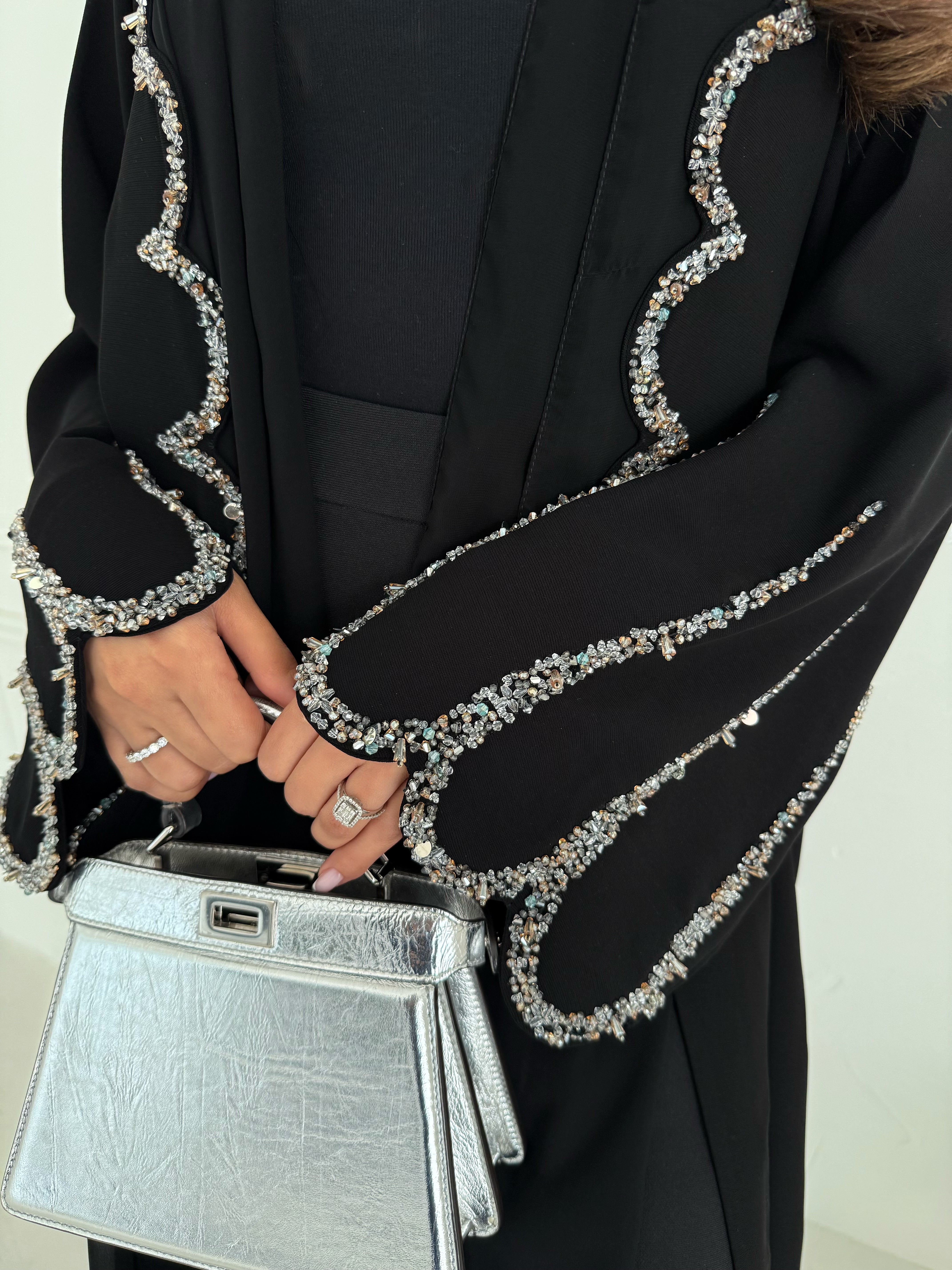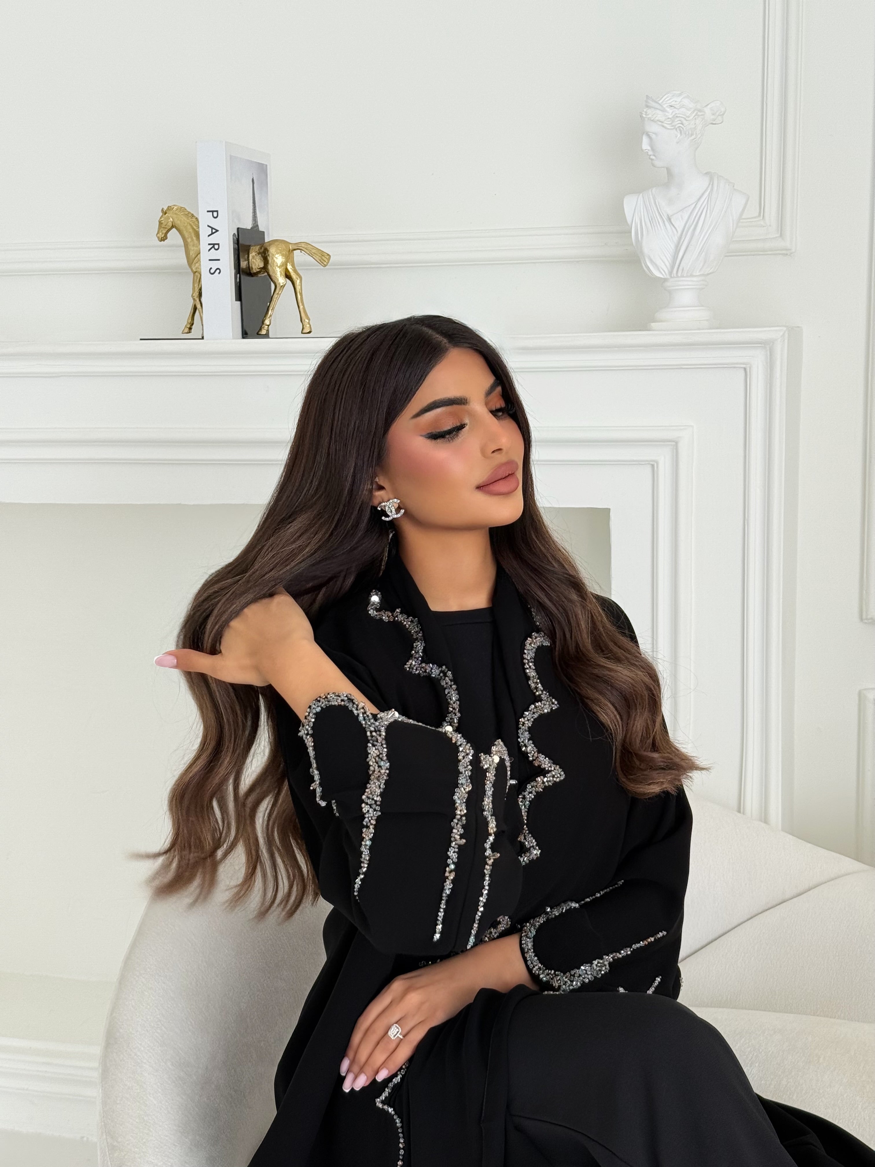 A black abaya accented with flowing, hand-applied crystal beadwork tracing organic lines across the front and sleeves. The shimmering details create a luminous contrast against the black base, offering a statement of modern elegance and refined craftsmanship.