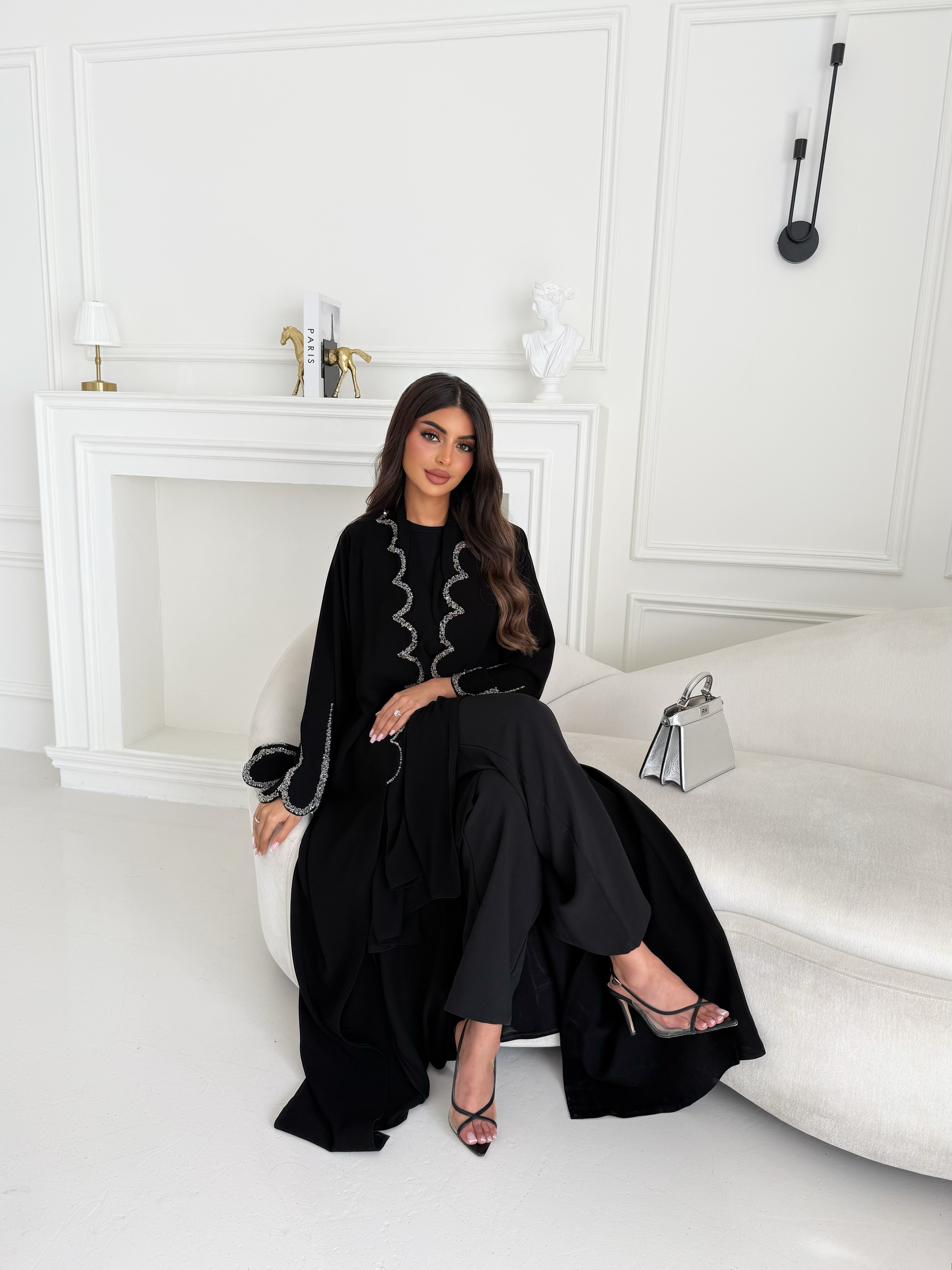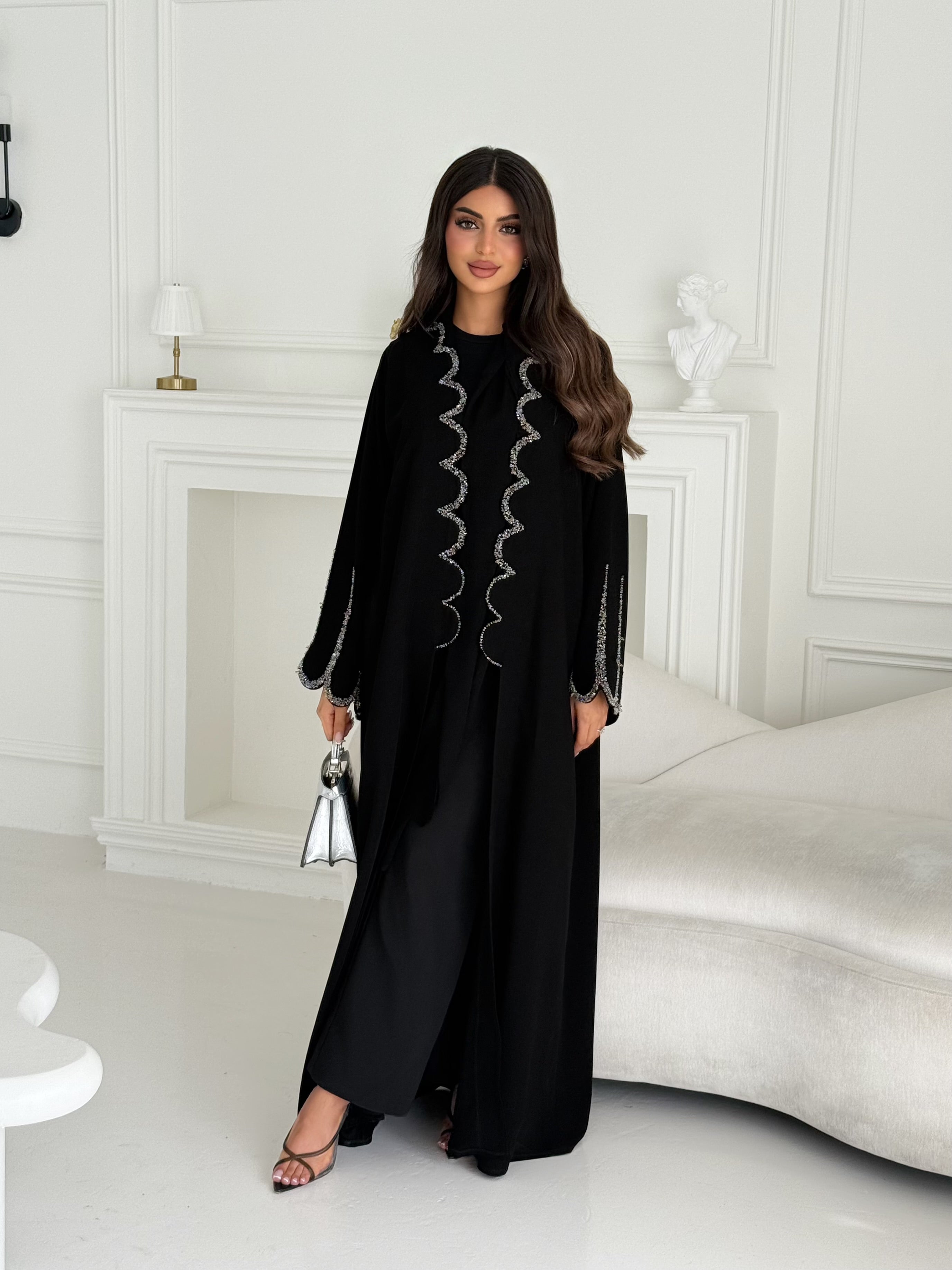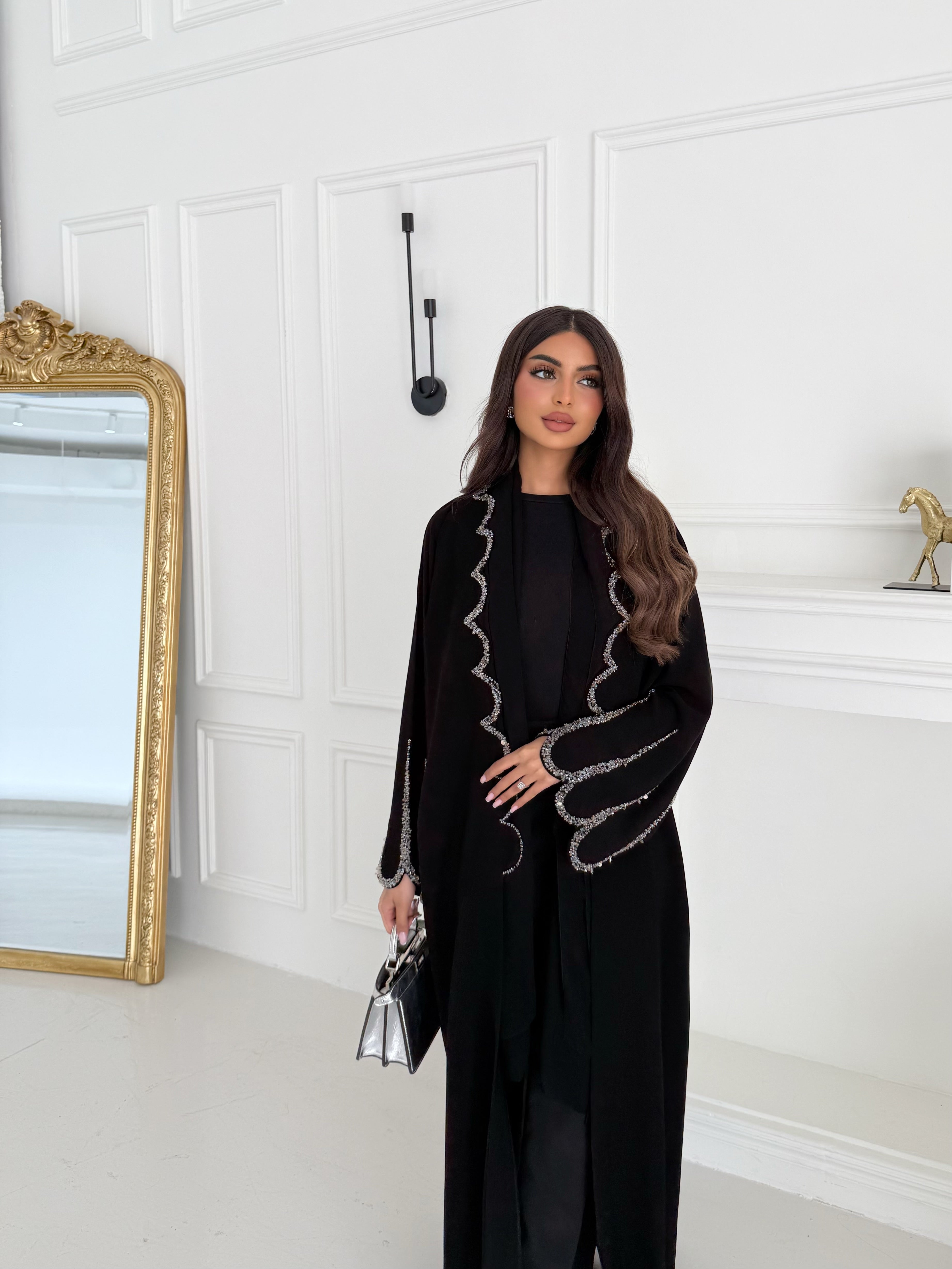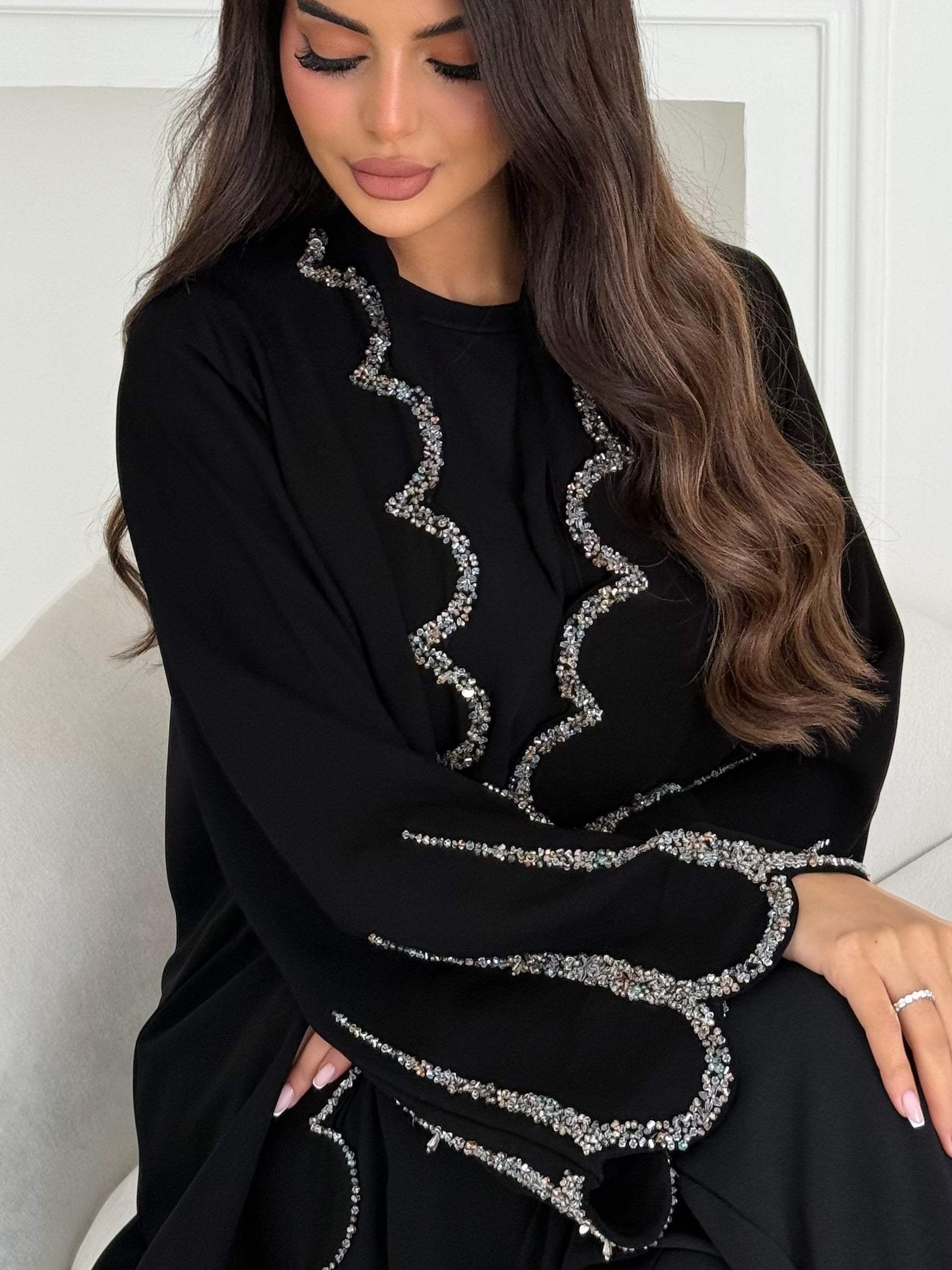 A black abaya accented with flowing, hand-applied crystal beadwork tracing organic lines across the front and sleeves. The shimmering details create a luminous contrast against the black base, offering a statement of modern elegance and refined craftsmanship.