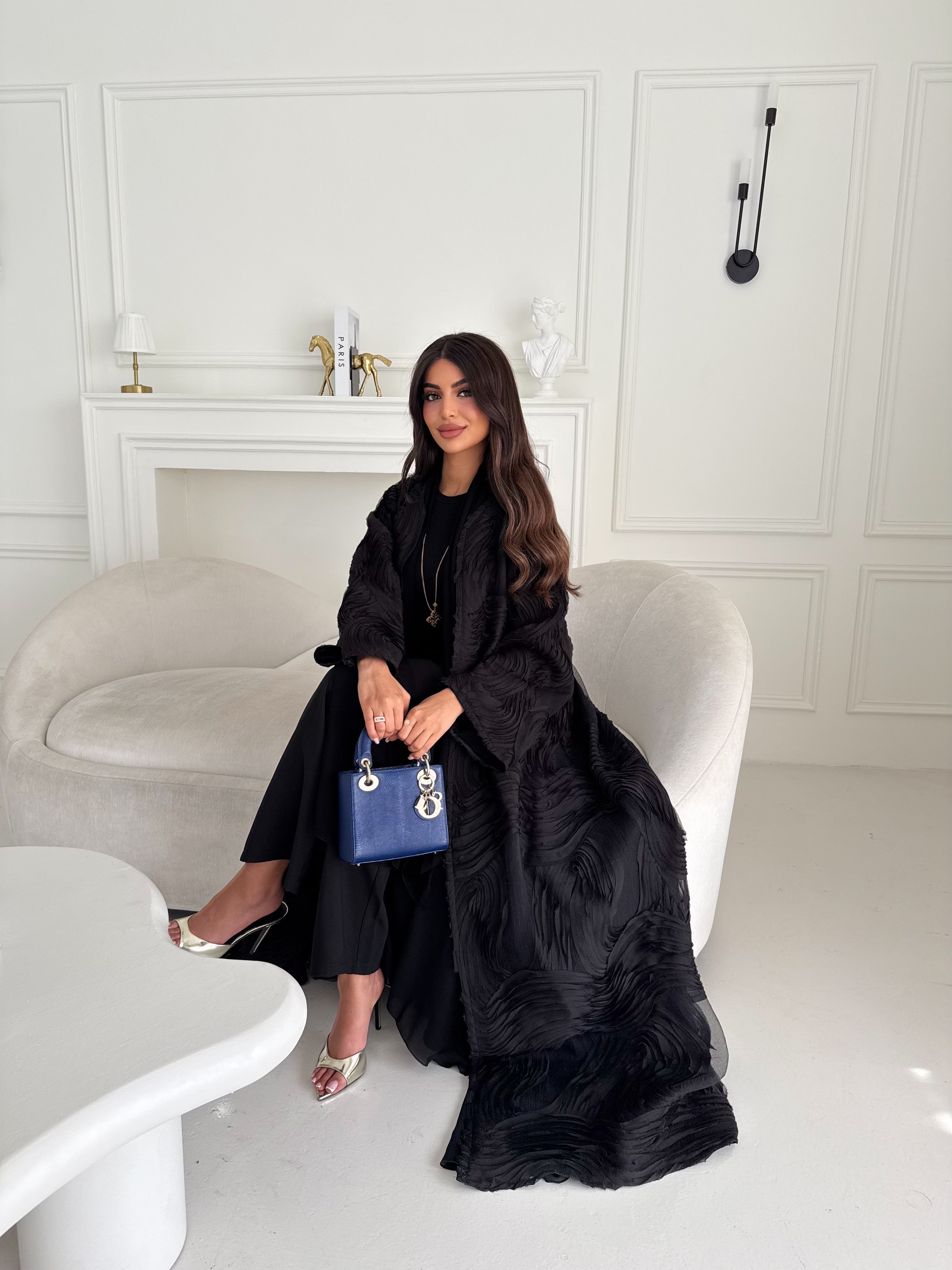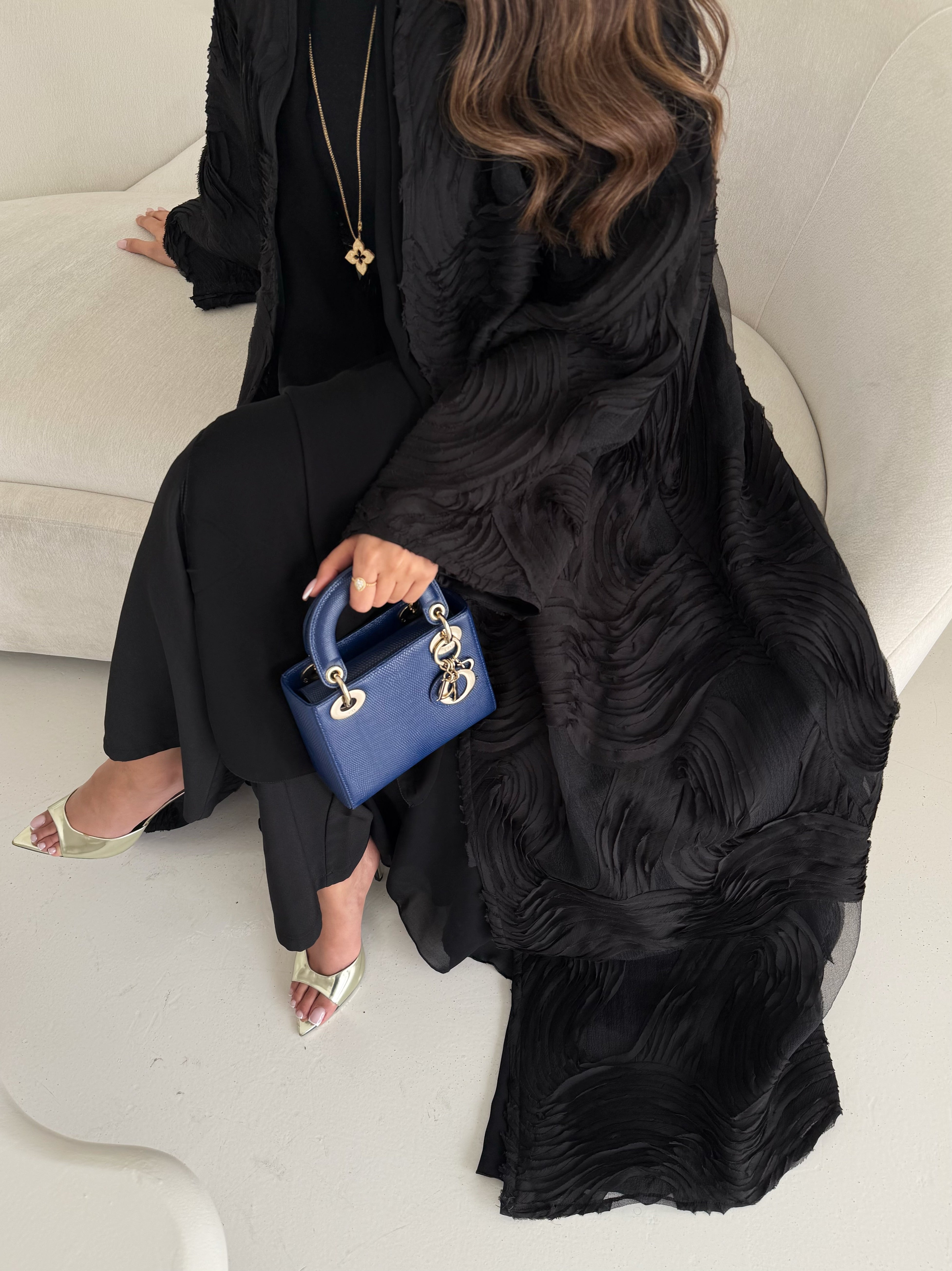 A flowing black abaya crafted from textured chiffon with sculpted wave detailing throughout. Lightweight, airy, and elegant in movement. Designed with wide sleeves and a graceful silhouette for a soft yet powerful presence.
