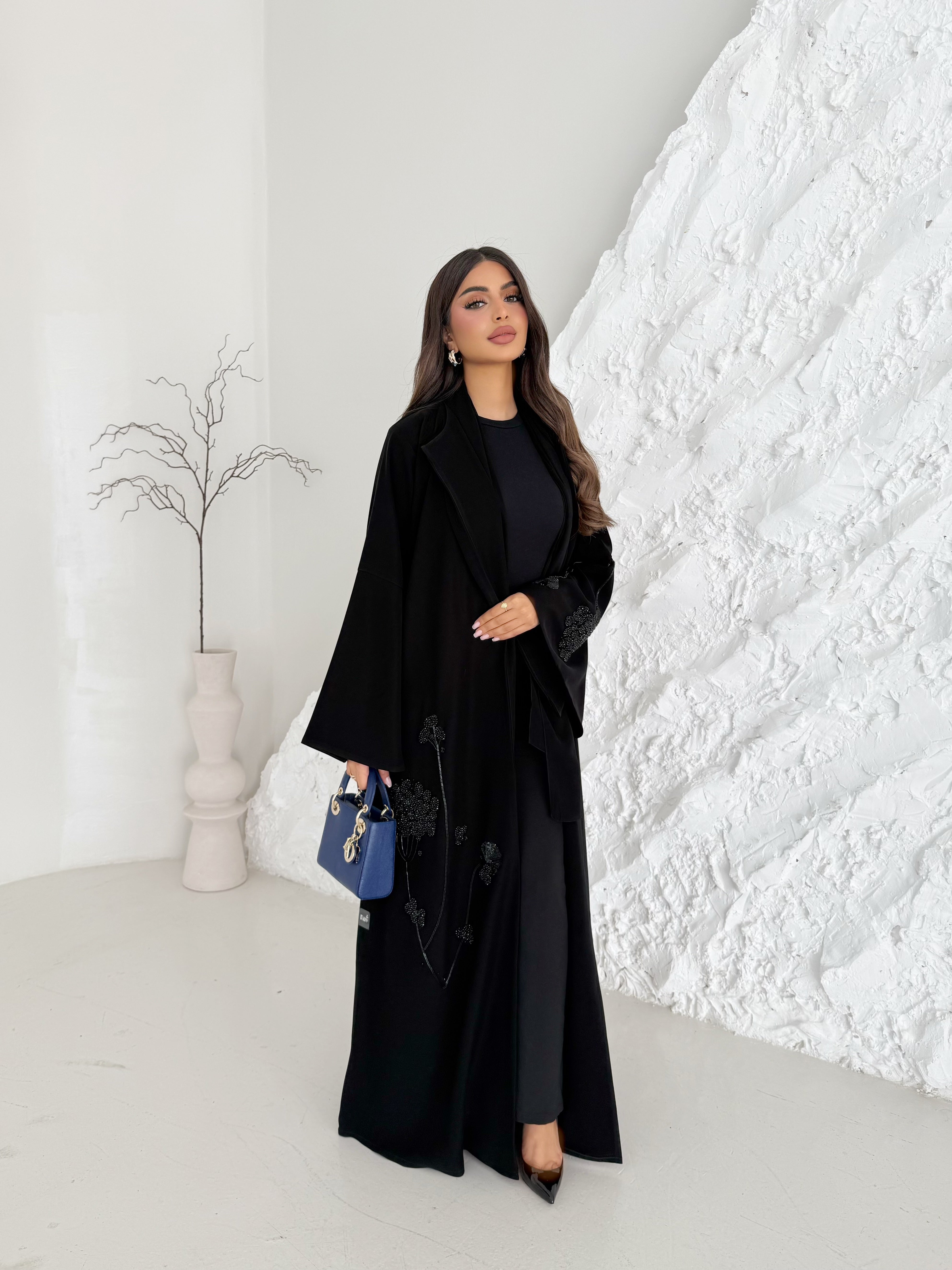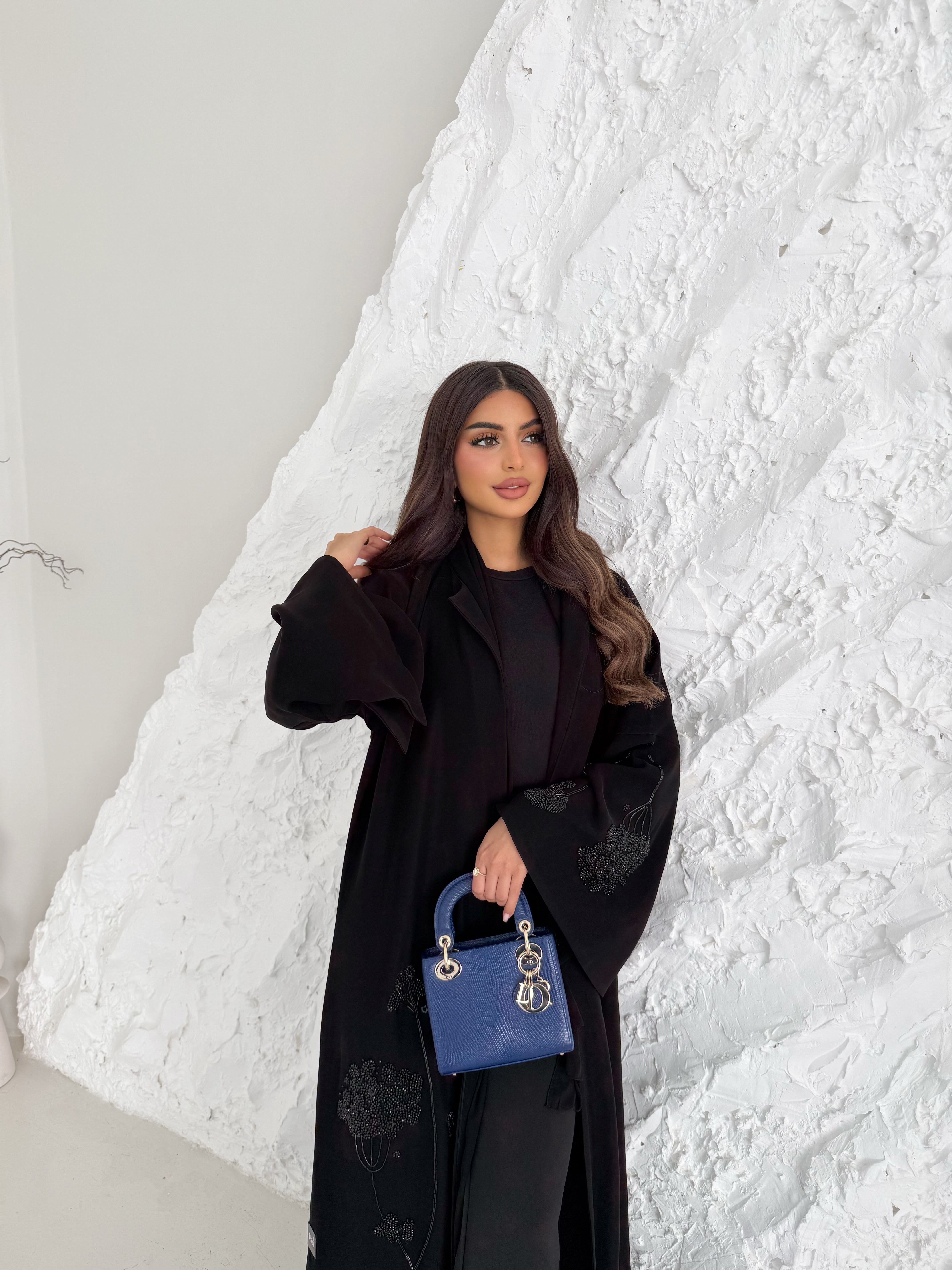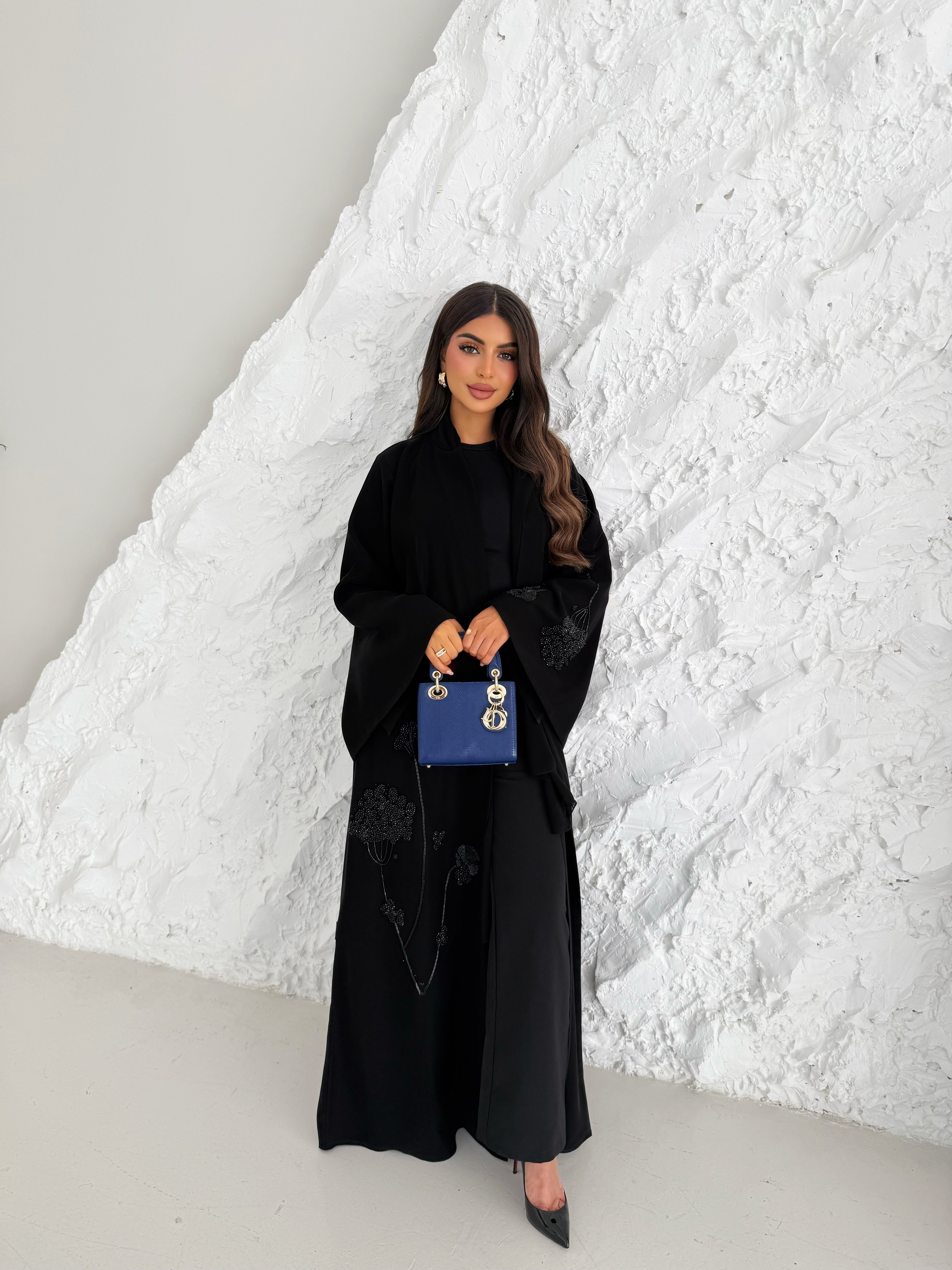 A luxurious black Barbie fabric abaya designed with wide triangular sleeves for a bold, sculpted silhouette.