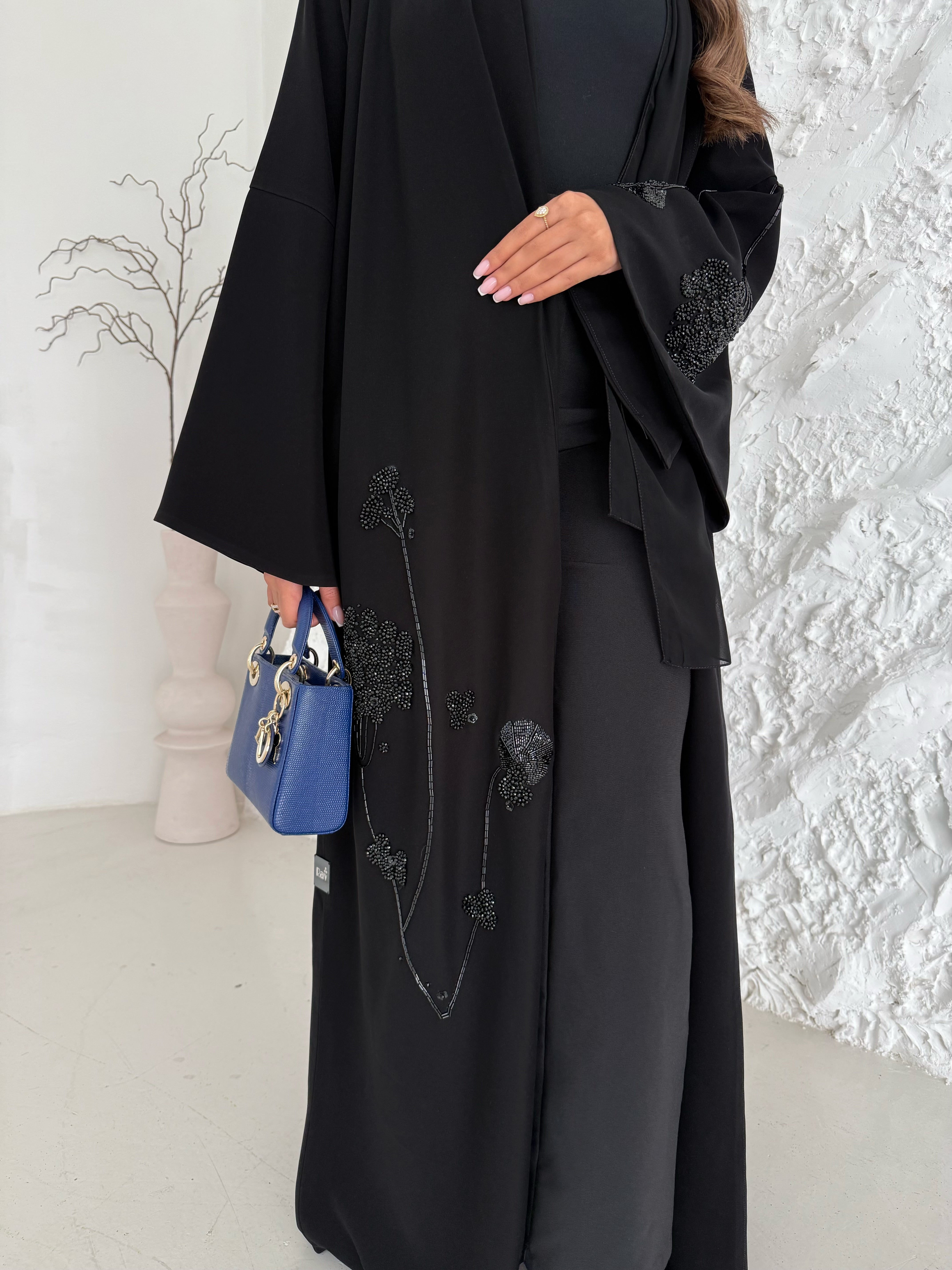 Hand-embellished with intricate black beadwork forming delicate floral patterns that subtly shimmer with movement.