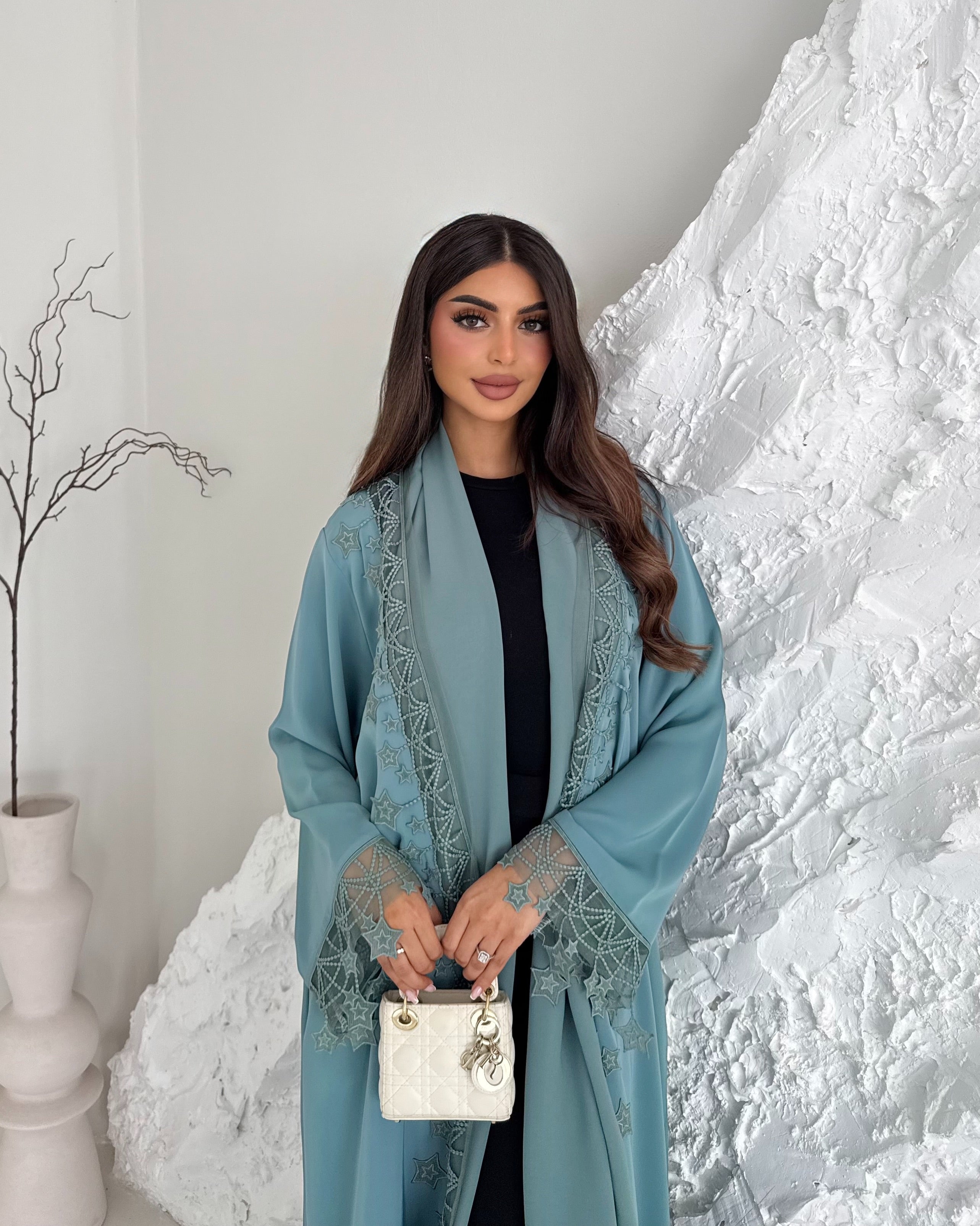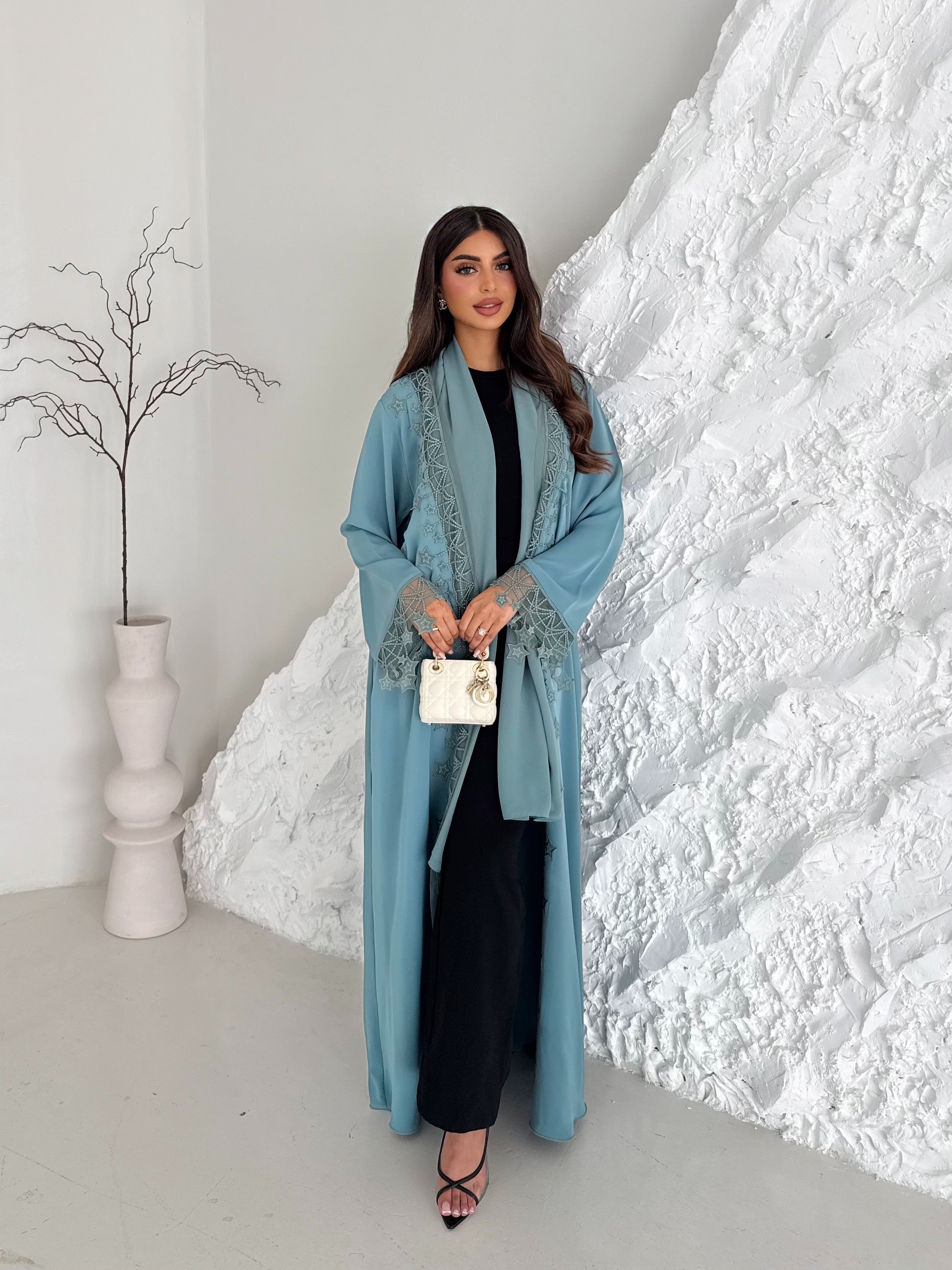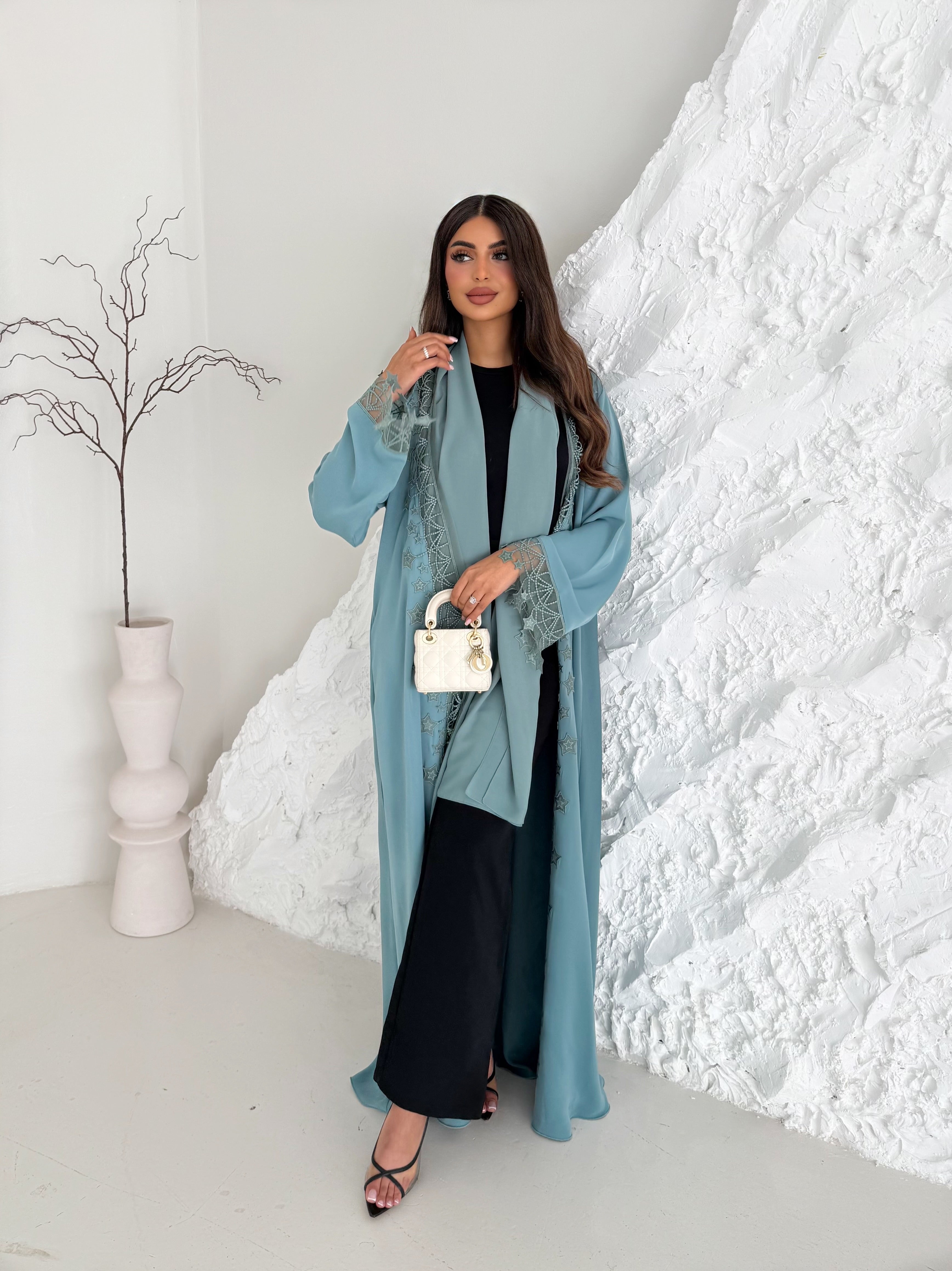 A classic light sage Nada abaya with a timeless straight cut, featuring delicate star embroidery on the sleeves and front. Designed to be versatile for both day and evening wear. Paired with a plain sheila.