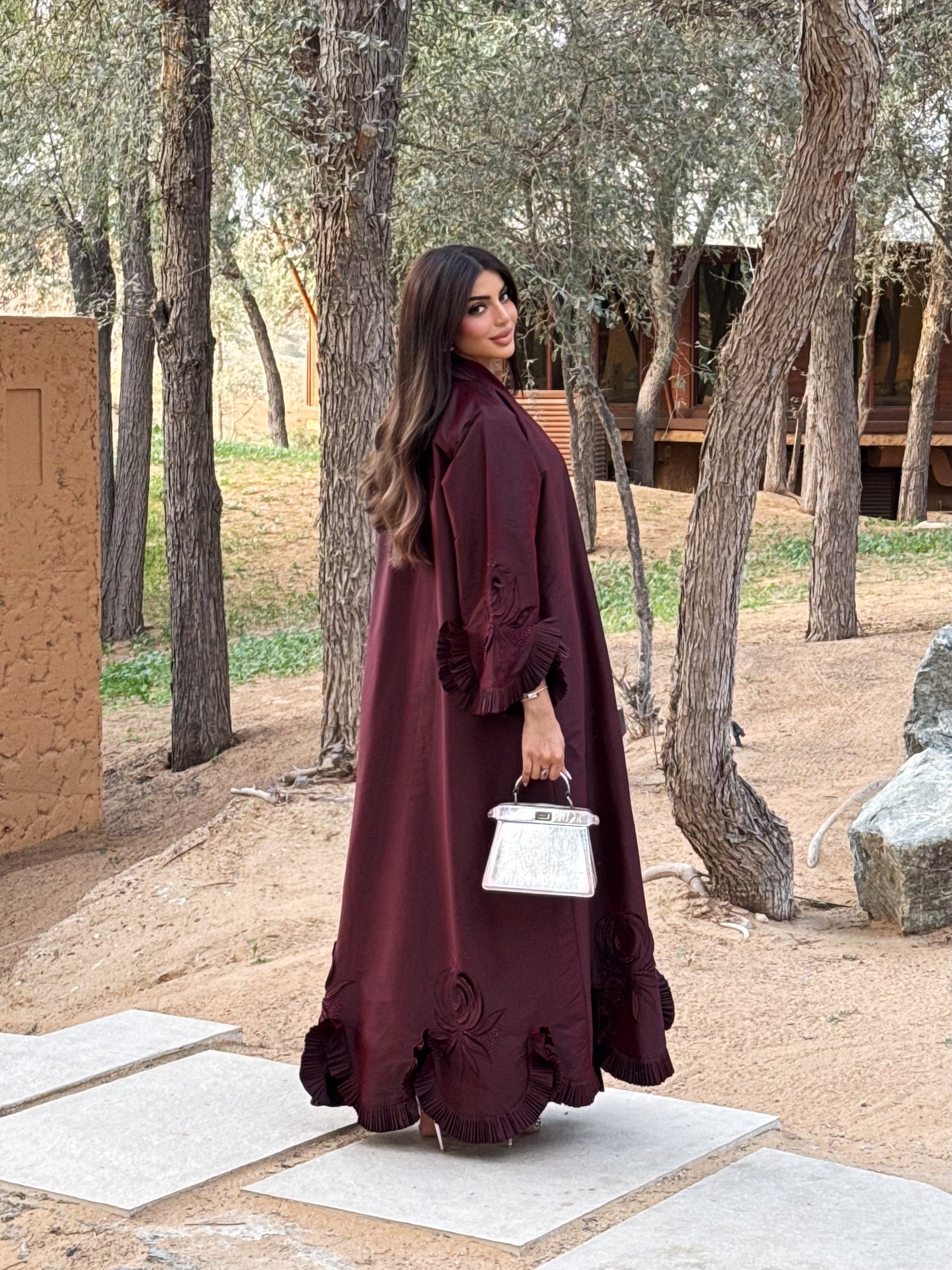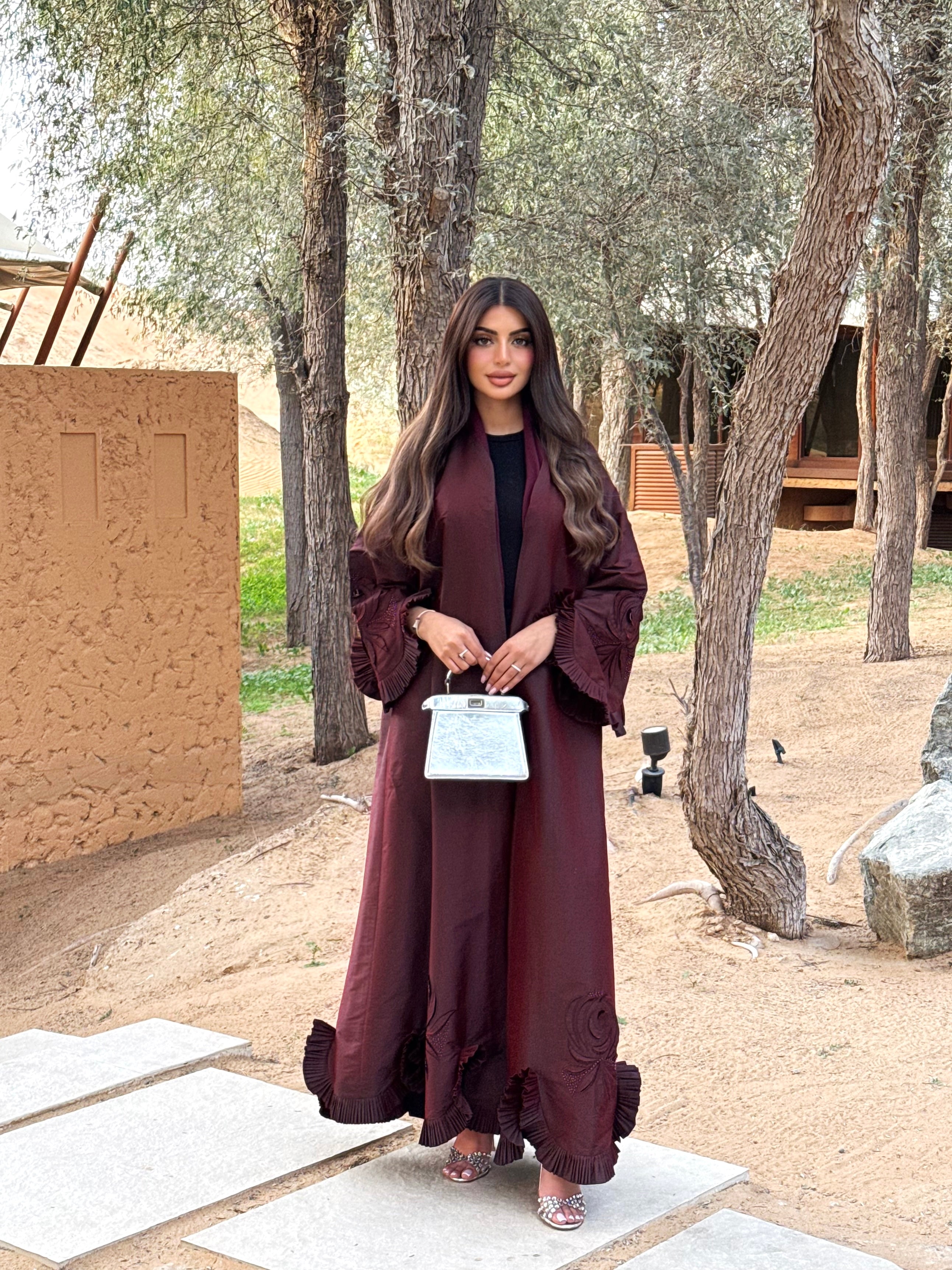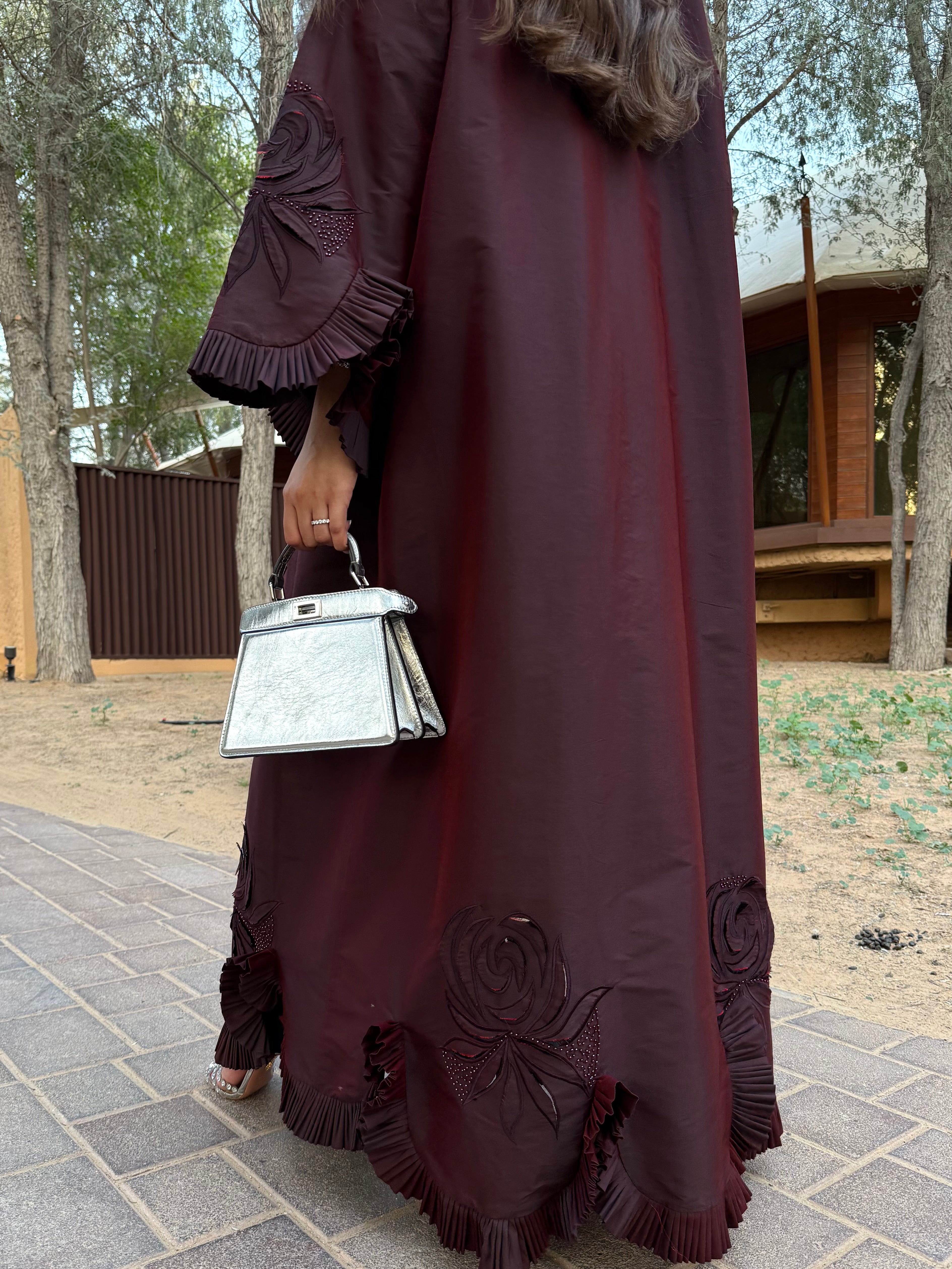 Structured taffeta abaya with a sculpted silhouette, finished with dimensional embroidery and subtle beadwork details. A bold yet elegant statement with refined pleated accents.