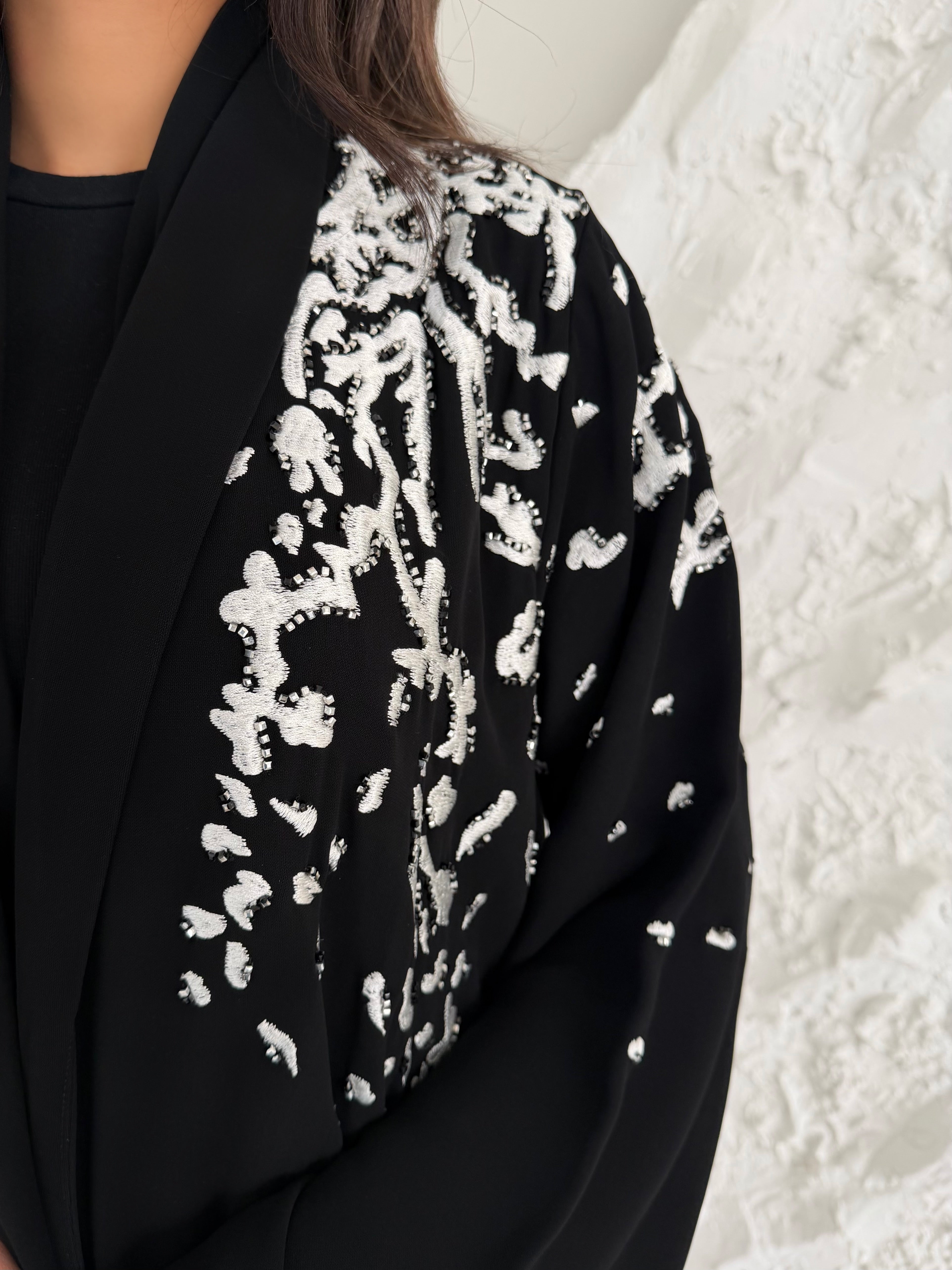 - Start measuring from the top of your shoulder, where the seam of the Abaya's shoulder would be, and run the measuring tape along the outside of your arm.